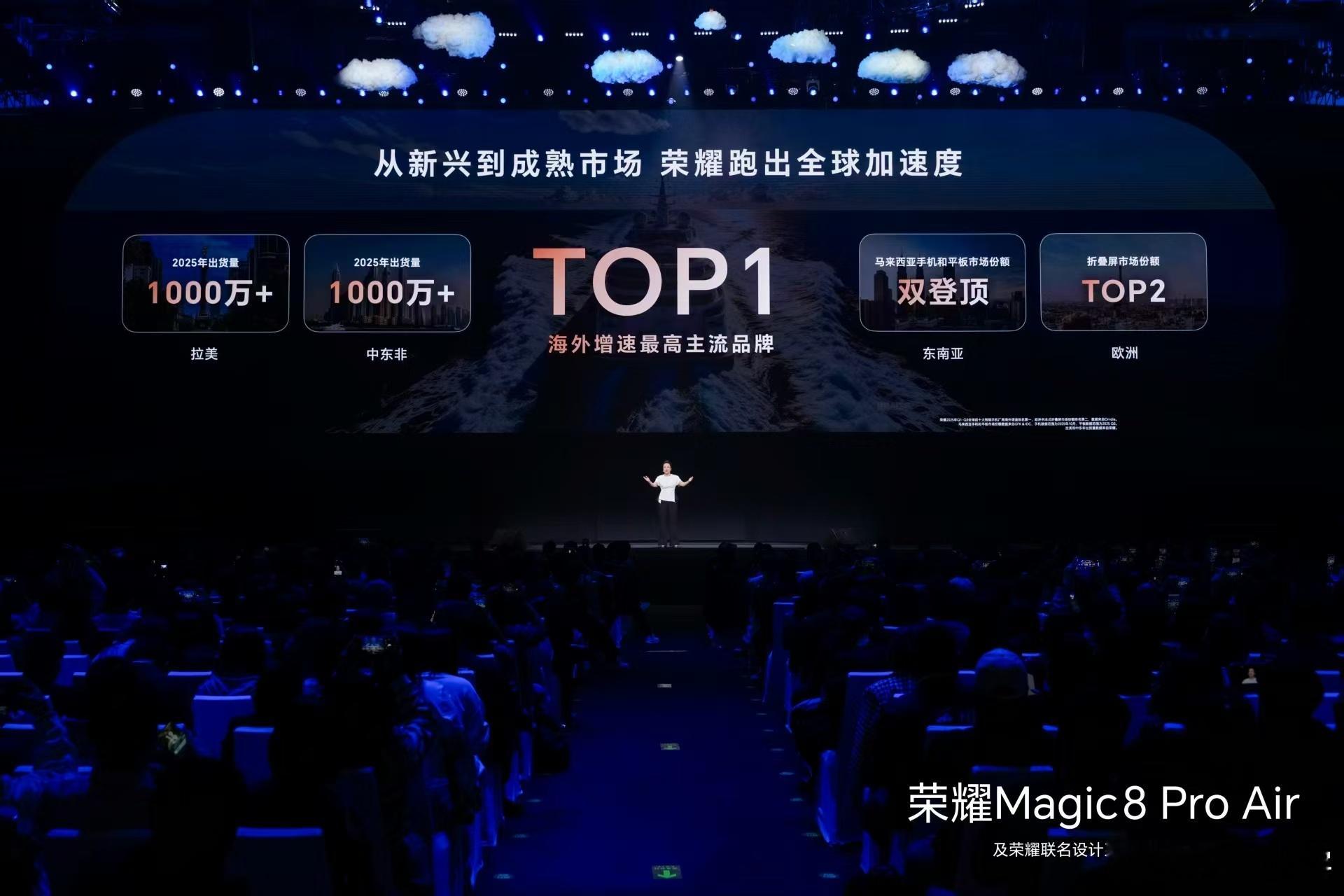 荣耀产品线总裁方飞宣布了荣耀2025年海外所有品牌增速第一,并发布了先锋设计极致科技的荣耀Magic8 Pro Air。