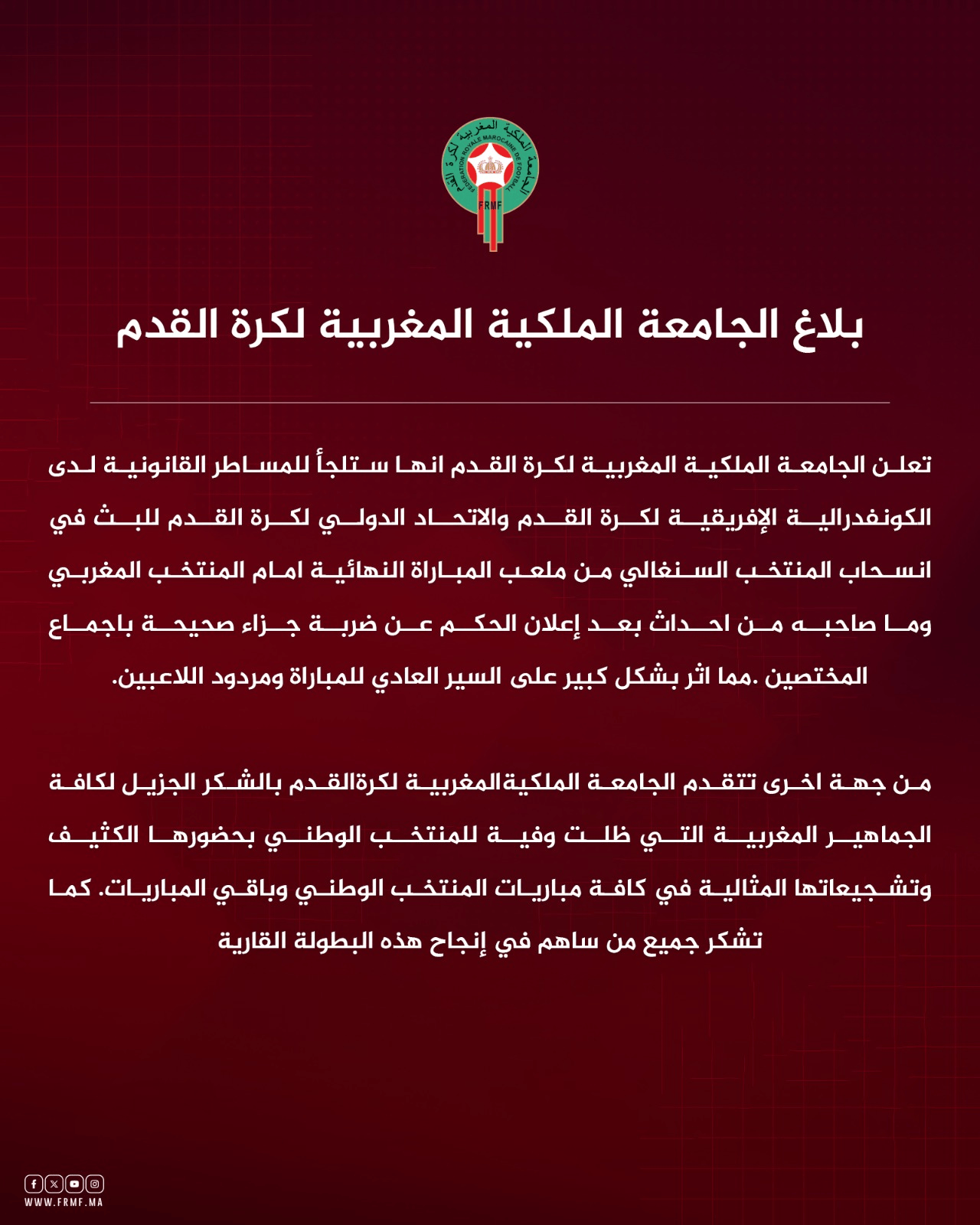 摩洛哥皇家足球协会宣布:在裁判经相关专业人员一致判定点球有效后,塞内加尔国家队退出了对阵摩洛哥国家队的决赛赛场,以及后续发生的相关事件,协会将向非洲足球联合会(CAF)和国际足球联合会(FIFA)采取法律行动。这一事件已对比赛的正常进行和球员的心理状态造成了重大影响。
