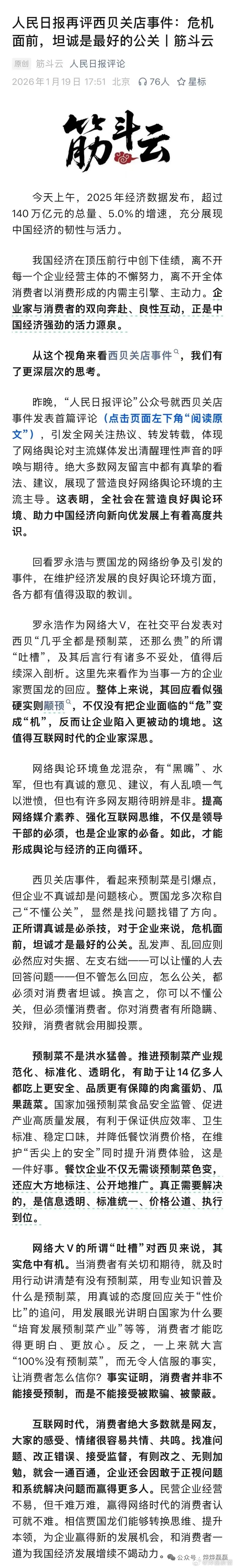 人民日报再评西贝关店事件:危机面前,坦诚是最好的公关。 罗永浩言行有诸多不妥,但贾国龙多次称自己“不懂公关”,显然是找问题找错了方向。 此前评论《人民日报评西贝关店事件:网络舆论环境不能成为企业发展的短板》。 站在企业的角度,你不要管他是不是大v,都看做是消费者。消费者心中有疑惑,有疑虑,企业耐心解答,消除消费者心中的疑惑,疑虑,问题就不是问题。网络时代,你看似是面对一个人,其实有很多人在看着,他们或许也有与提问题的人有相同的问题,这其中就有潜在的客户,你解答问题的态度诚恳,真心把消费者当衣食父母,你又有切实的处理问题的能力,问题就不是问题。本来问题没有那么大,你带情绪的处理方式,不仅惹恼了消费者,也寒了员工的心,我的老板不尊重消费者,还能尊重我们?其他企业的老板也应该从中吸取教训,面对舆情一定要有诚恳的态度,实打实的行动! 出现问题不能说一味攻击提出问题的人,首先要自省,坦诚,那么多餐饮企业消费者和你无冤无仇为什么只针对你?从始至终就知道甩锅推卸责任教育消费者可不是一个企业家应有的担当。 贾总搞错了对象,即使没有老罗,也会有老周,老张,老李吐槽的。其实这一次应对得当的话,是一次多大的流量啊,可以把行业协会,吃瓜群众,食品协会拉到一起大家坐下来坦诚布公的谈,这不比你找什么华与华要强得多吗? 企业在面临这类问题时应该多学老乡鸡。顾客质疑预制菜,老乡鸡就发布了20万字的溯源报告,把每道菜的加工方式公布出来并做红黄绿做区分。打假博主质疑葱油鸡分量不够,老乡鸡不仅找到分量差异的原因而且直接补足了生产过程中的损耗!开诚布公,坦诚相待,这才是优秀企业该有的做法。真诚才是永远的必杀技!