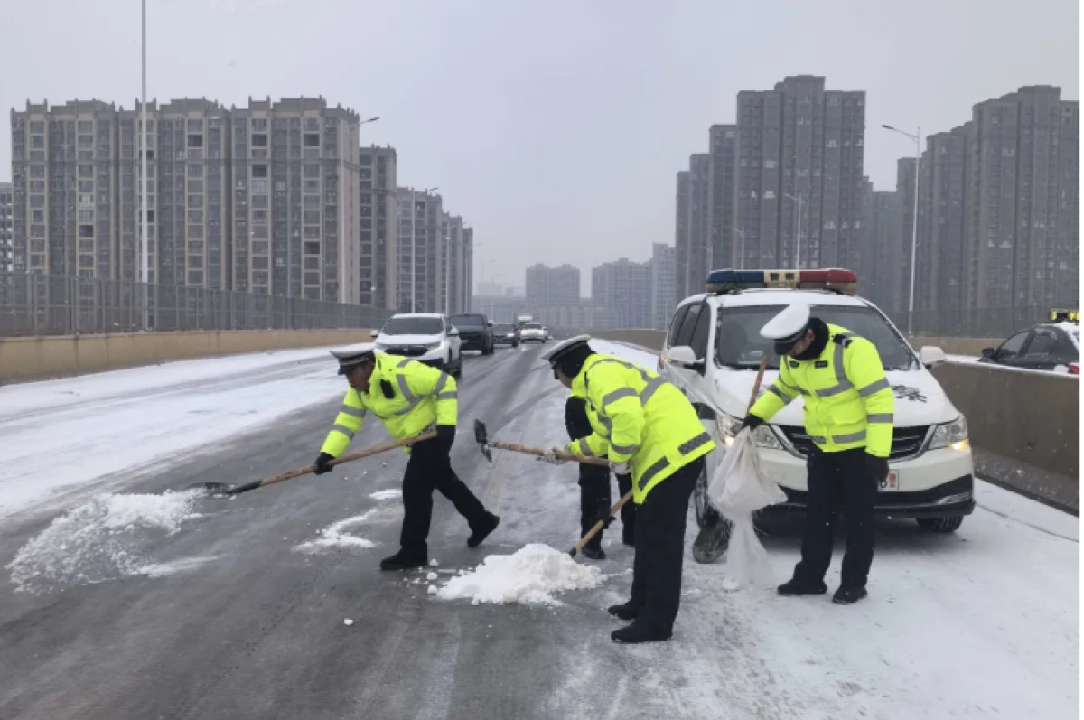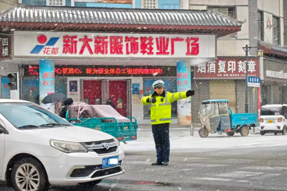 在各中心城区主干道十字路口,交警们顶着刺骨寒风,指挥引导车辆有序通行,帽檐、肩头很快积起薄雪却无暇擦拭,对过往行人、车辆,交警反复提醒驾驶员“减速慢行、保持车距”。