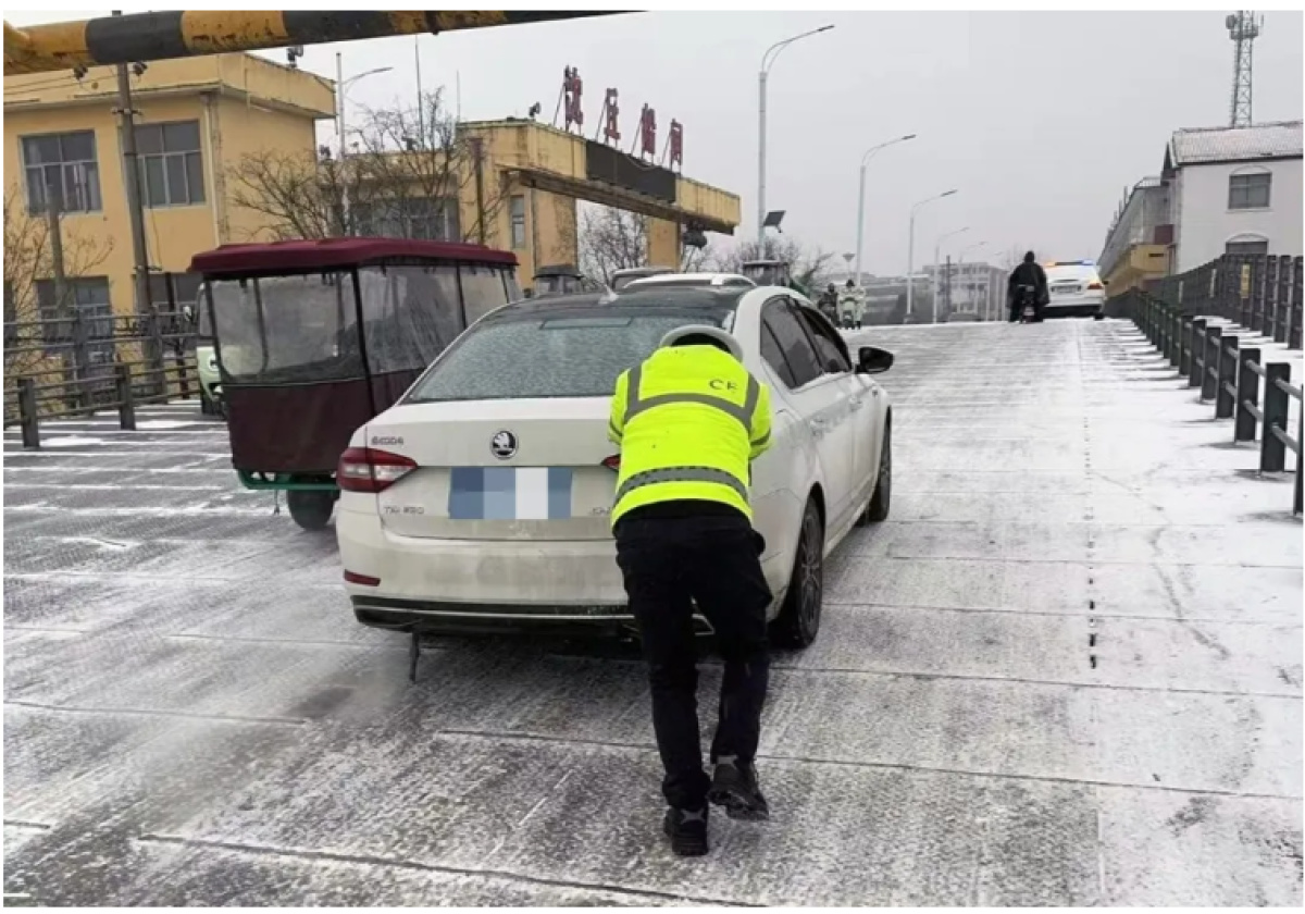 在桥梁、涵洞等易滑路段,派专人值守提醒,防止过往行人、车辆发生交通事故,遇到上坡车辆打滑的,交警毫不犹豫上前帮忙推车。在沙颍河沈丘大闸,因帮忙推桥上抛锚的车辆,沈丘县交警大队教导员刘涛磕伤了膝盖,但他忍着痛到附近诊所简单包扎后继续返回岗位。