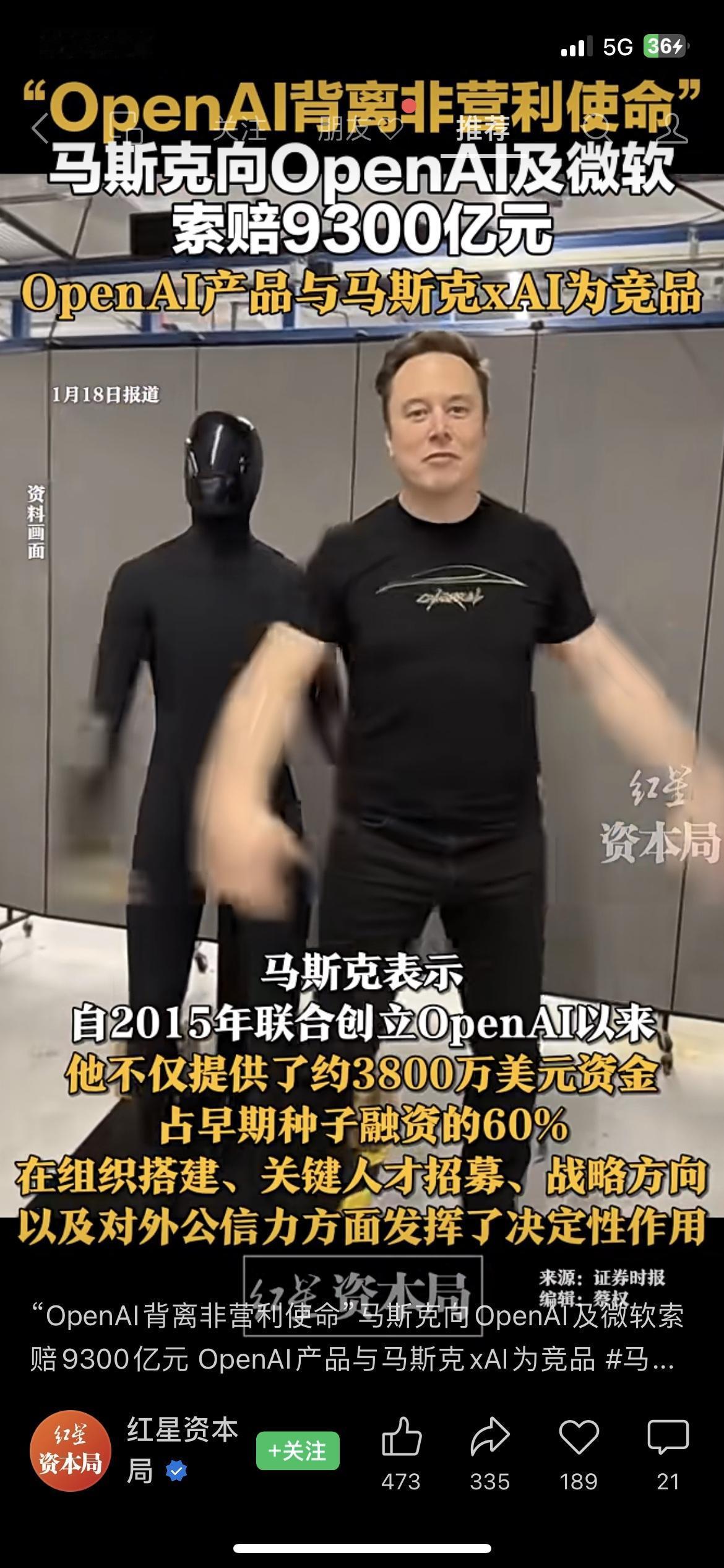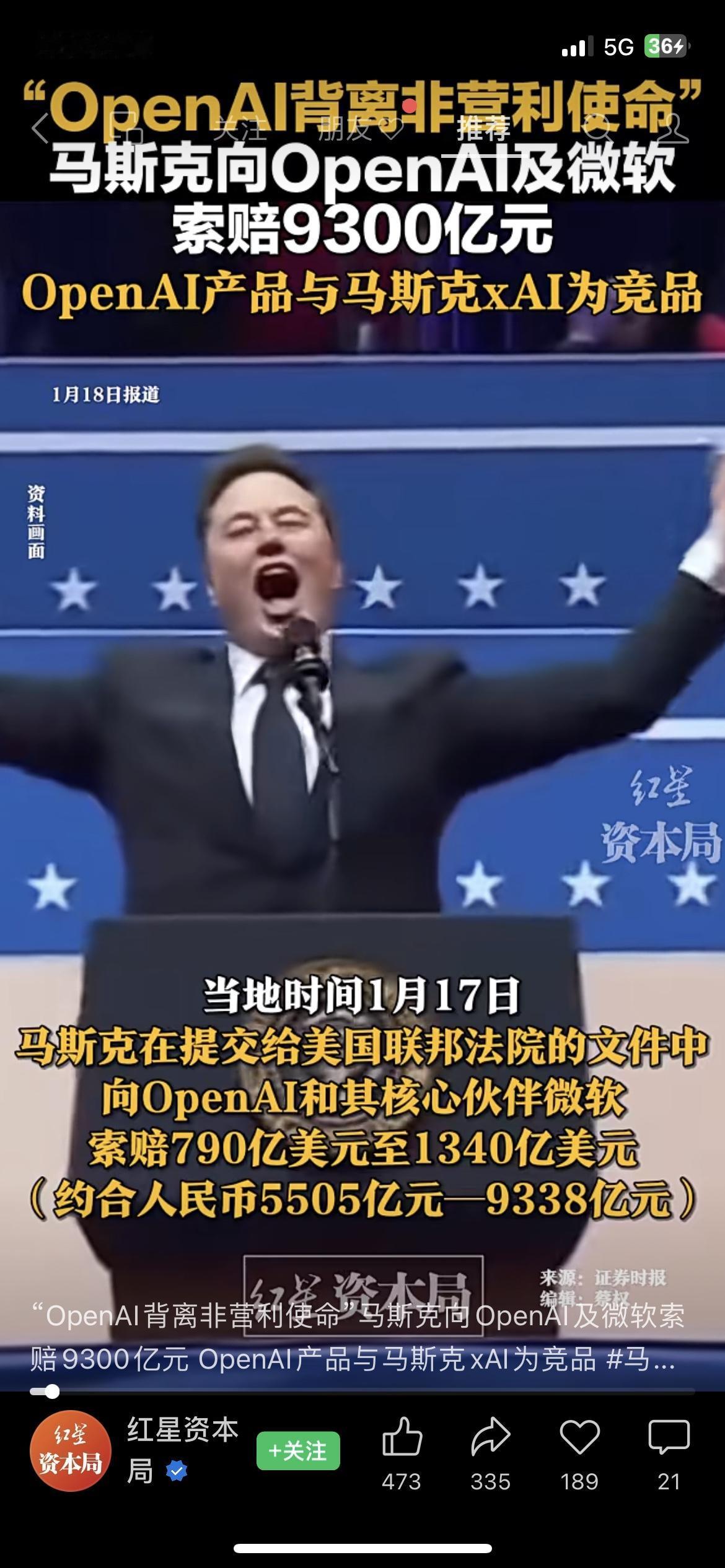 马斯克炸锅!索赔OpenAI9300亿! 马斯克怒告OpenAI+微软,张口就要9300亿赔偿,理由是对方背离非营利初心,还跟自己的xAI正面硬刚抢市场,懂的都懂,这哪是讲情怀,就是商业竞争的阳谋!我身边做AI的朋友都在吃瓜,说这波瓜太大了。 科技圈的恩怨,从来都是生意大于理想。 你觉得马斯克这波能胜诉吗?会站队哪一方? 马斯克 OpenAI