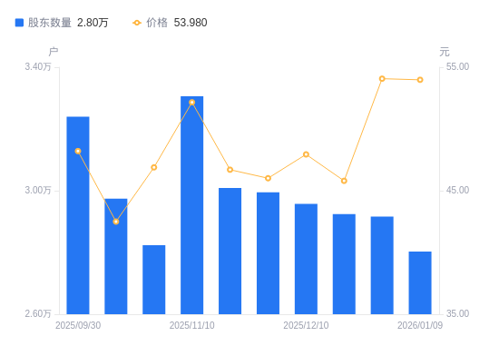 日期A股户数(户)流通A股户均持股数(股)户均持股市值(万元)2026-01-09280266509.1435.142025-12-31291616255.7933.832025-12-19292446238.0428.572025-12-10295706169.2729.582025-11-28299466091.8128.032025-11-20300896062.8528.312025-11-10330615517.8428.782025-10-31282366460.7330.292025-10-20297446133.1826.072025-09-30323975630.9327.15
