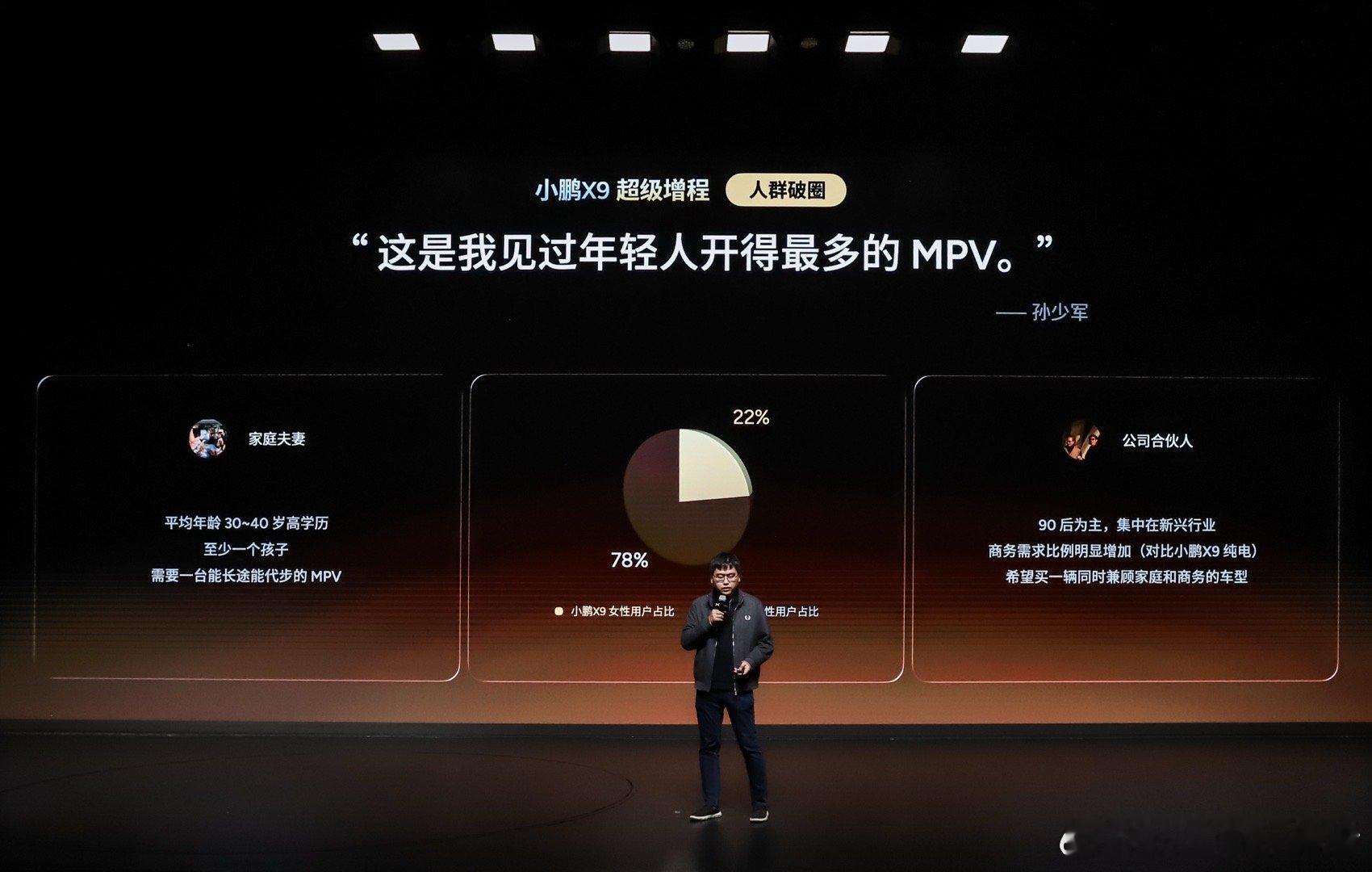 很多车型在产品发布之后就悄无声息了,无论热卖或是低迷,都完全靠发布会的惯性,没有持续在市场上发声的意向或策略,这是不应该的。上市之后通过PR或媒介投放以保持声量,在外企叫“sustaining campaign”,而此次小鹏别出心裁,在X9增程版上市之后搞了一场“用户画像分享交流会”,详细分享了X9增程版客户热销的原因、客户的特点与技术偏好,给类似客户的购买提供了启发与参考。由于今年的MPV市场会更加激烈,通过X9增程版的持续发声,小鹏可以先声夺人,进一步夯实客户的认知,在竞争中取得优势。在新能源MPV市场,小鹏X9有以下优势颇受年轻客户的青睐:1. 不同于传统MPV的沉闷 “方盒子” 的星舰外形,让小鹏 X9 超级增程外观造型前卫不“老登”、不油腻,符合年轻用户审美,具有很高的辨识度。2. 63.3度大电池,纯电续航452公里,可油可电、续航无忧。再加上主动式后轮转向与智能扭矩控制三大核心技术,提供「冰雪模式」和「脱困模式」,同时行业首发的dTCS2.0 前馈分布式牵引力控制技术,防滑稳行、快速脱困,对北方客户特别友好。3. 2250 TOPs强大算力支撑VLM私人管家和全场景VLA功能,让车机系统不但好开、而且智能。4. 买MPV的客户,核心需求就是空间,无论是乘坐还是载物,既要空间大,也要灵活的座椅调整,该车支持三排4/6分独立收纳,可无缝切换7座满员、6座带宠物、5座载自行车、4座露营大床房等多元模式,真正实现一车搞定通勤、带娃、社交、远行多种出行场景。在这些技术的赋能之下,2025年12月,小鹏X9交付量5,424台,同比增速289.1%。在首批客户中,首购比例高达 21%,接近行业两倍。90后占比高达57.2%,00后占比13.7%,意味着小鹏X9超级增程客户比MPV用户平均年龄年轻10岁,展现出明显的年轻化趋势。同时,女性车主占比22%,反映出其在家庭用户中的吸引力。随着电池技术的进步、充电桩的进一步普及,客户的里程焦虑在降低,但并没有完全消失,尤其是MPV和大型SUV,因此,超级增程带来的超长续航确实是一个很好的解决方案。大v聊车小鹏X9超级增程首个用户画像报告发布
