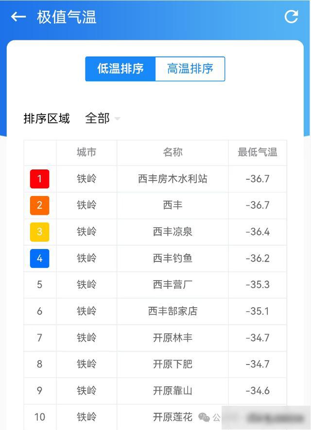 今天早上,辽宁中部、北部最低气温均降至-20℃以下,铁岭东部、抚顺东部跌破-30℃,西丰最冷,-36.7℃、-36.4℃、-36.2℃……一直到-34.4℃,低温极值的前10全都出现在铁岭。