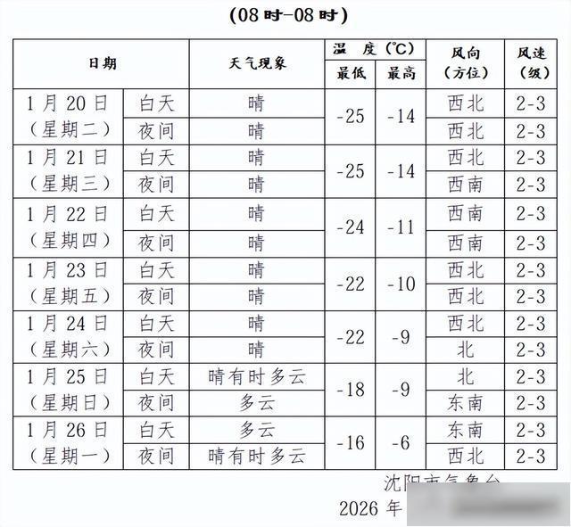 在2026年首场寒潮的影响下,沈阳迎来今冬最冷白天,今天的最高气温只有-16℃。特别要注意的是,今天开始到21日,沈阳将迎今年入冬以来最冷时段,最低气温-25℃左右,最高气温-16℃~-14℃,平均气温-20℃左右,较历史同期偏低8℃左右。明天还将迎来大寒节气,非常应景。沈阳未来一周最低温度基本都在-20℃以下!