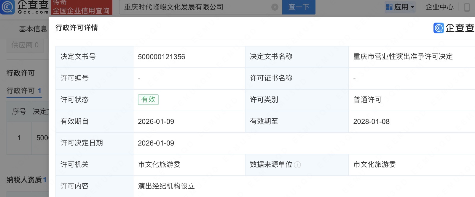 企查查APP显示,近日,重庆时代峰峻文化发展有限公司新增一则行政许可信息,许可证名称为重庆市营业性演出准予许可决定,许可内容为演出经纪机构设立,许可机关为市文化旅游委。