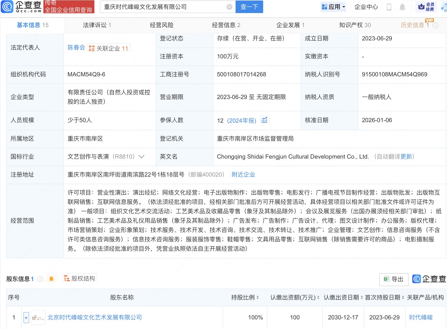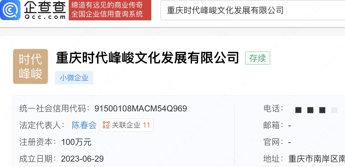 该公司成立于2023年6月,经营范围含营业性演出、演出经纪、网络文化经营等,由北京时代峰峻文化艺术发展有限公司全资持股。