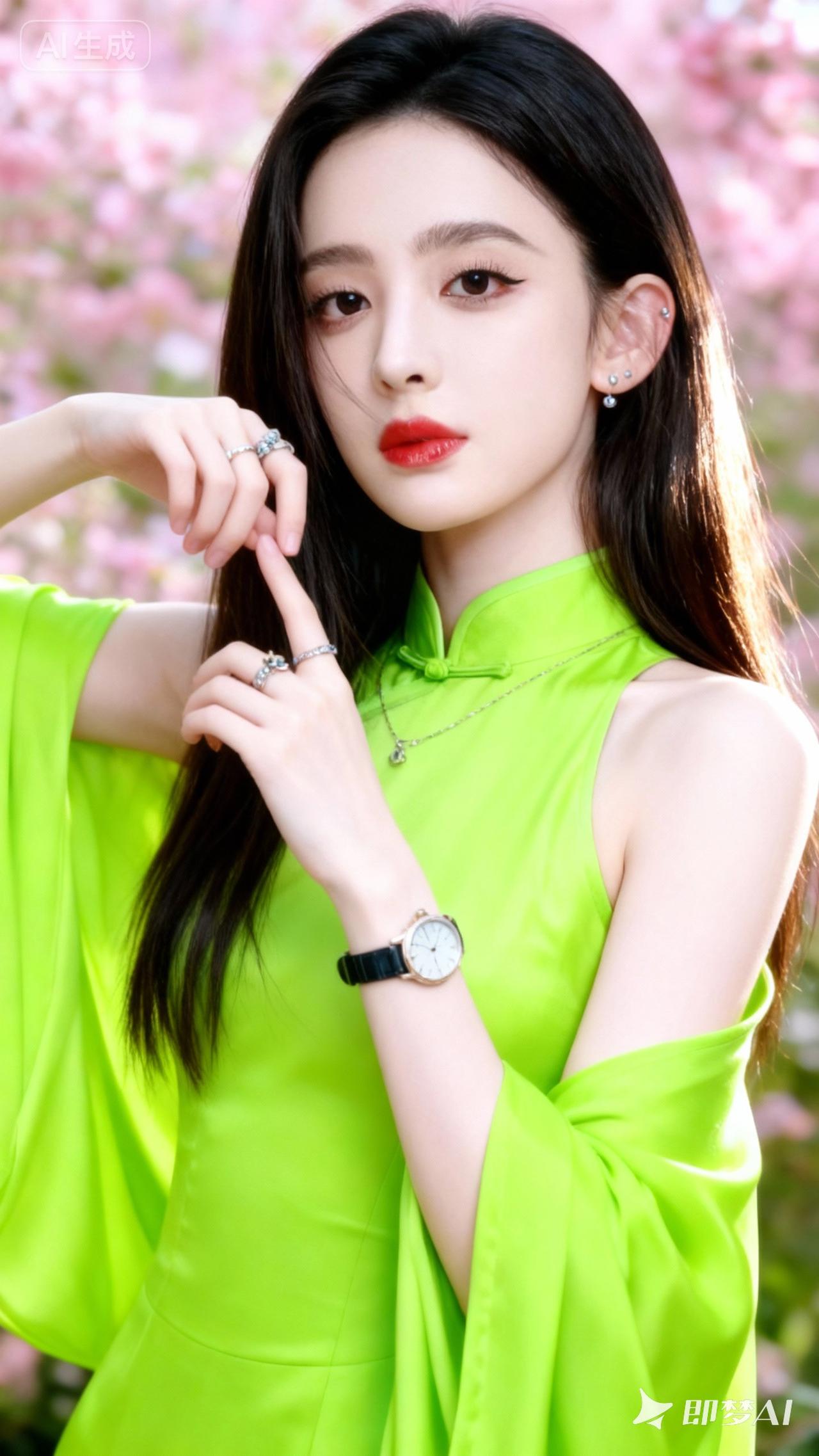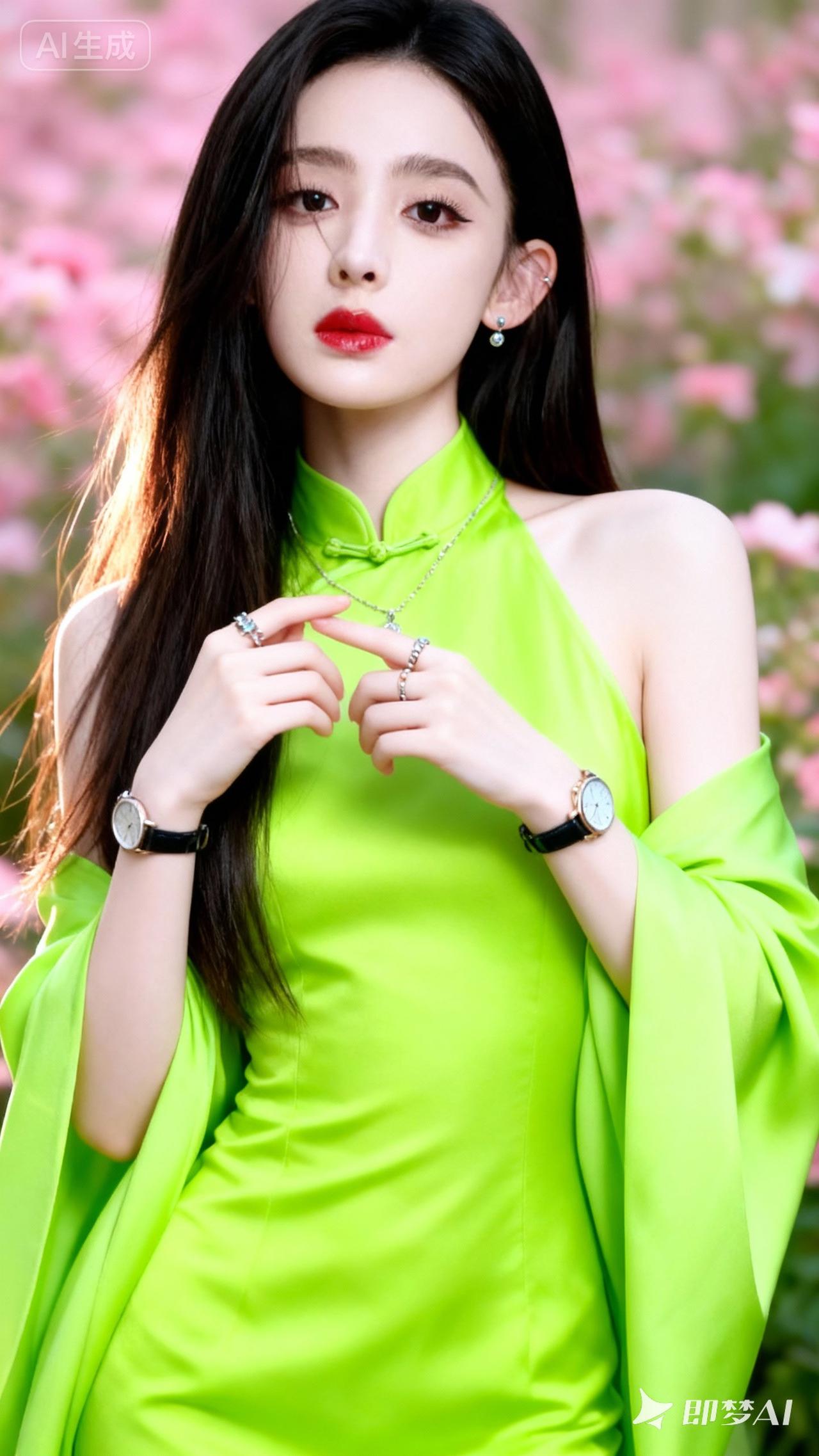 清新脱俗的绿衣少女,粉色花海中的优雅之美。