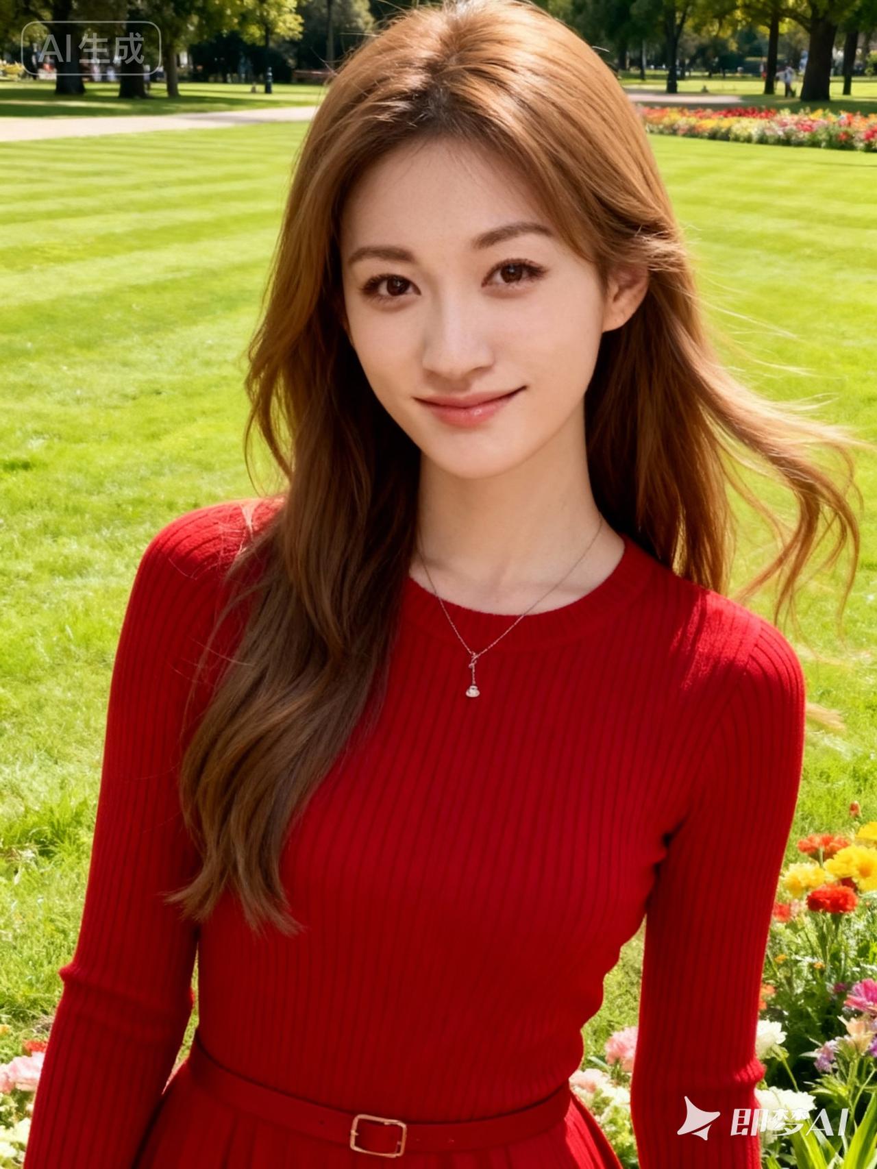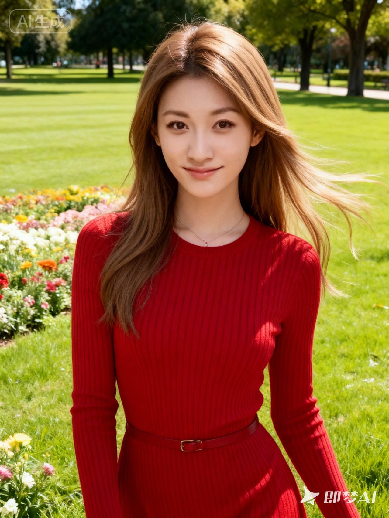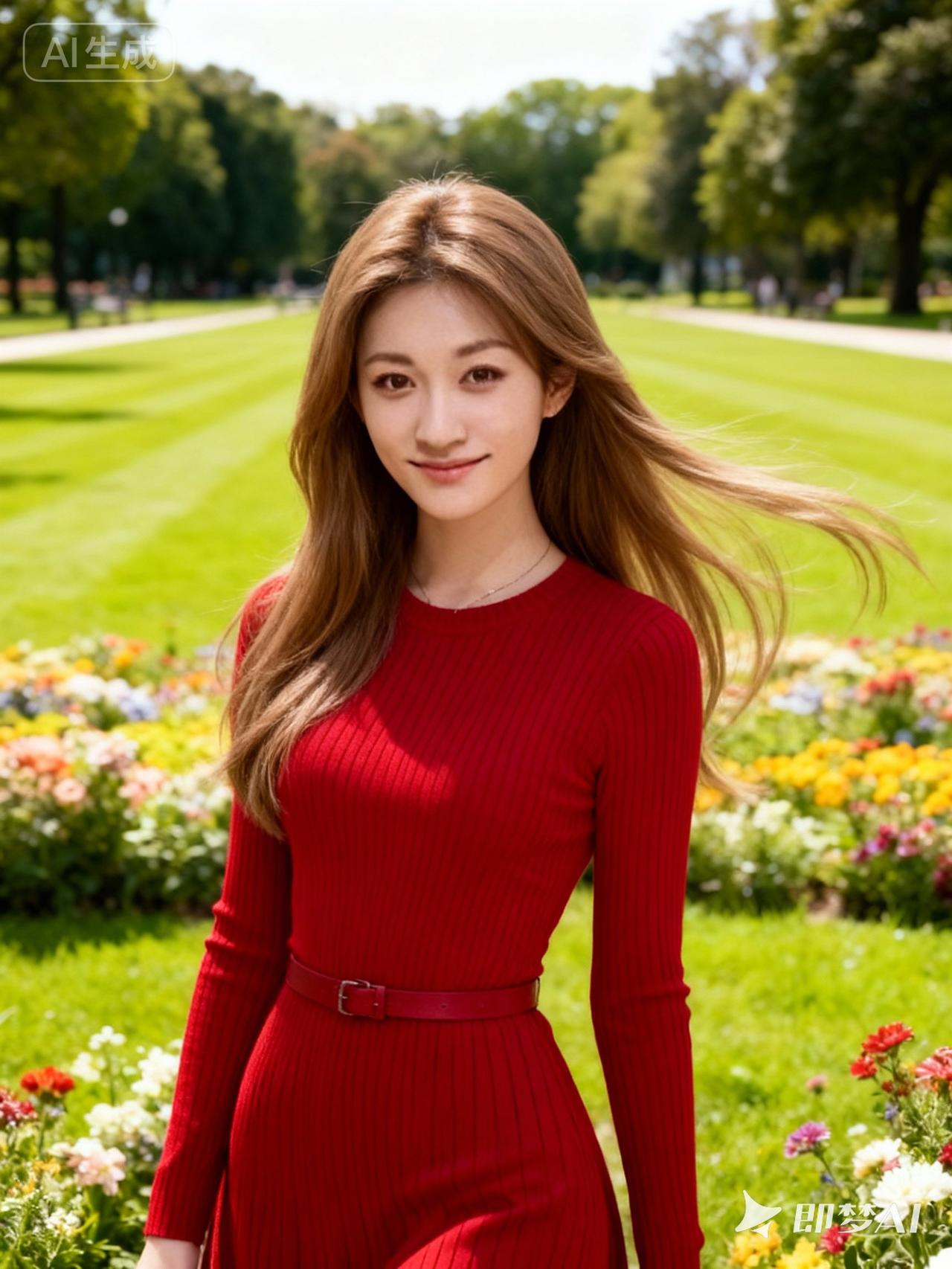 阳光明媚的公园里,红裙少女微笑面对镜头,花海中绽放出青春的活力。