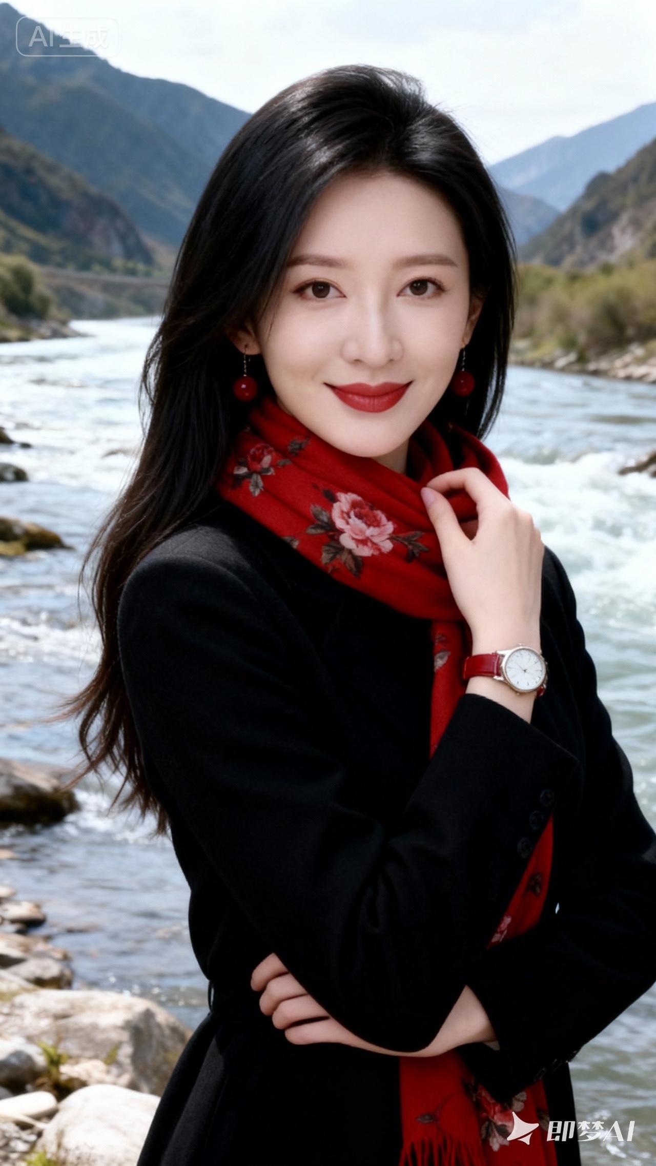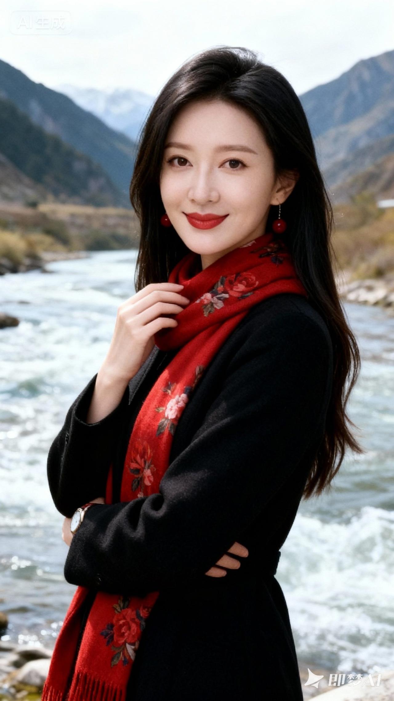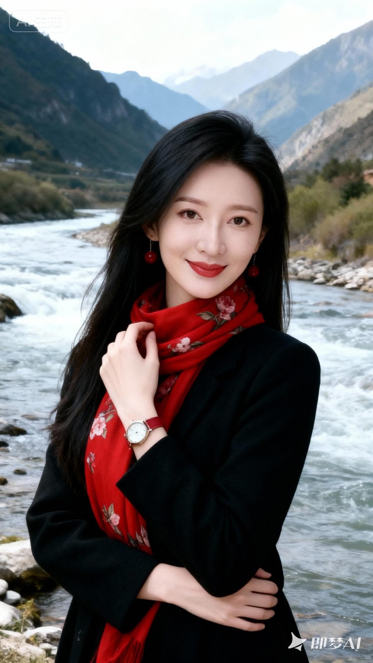 在山间小溪旁,红围巾映衬下的她,宛如冬日里的一抹暖阳。