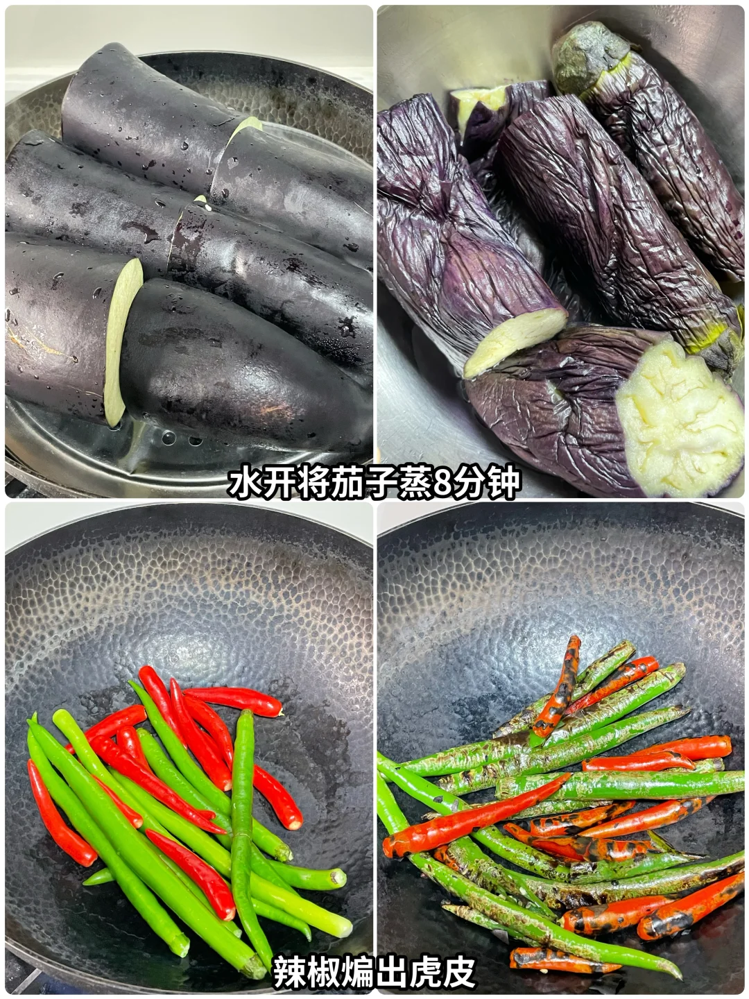 1⃣️先将茄子水开上锅蒸8分钟。放凉撕条备用,然后将二荆条和小米辣煸出虎皮状,盛出撕条备用。
