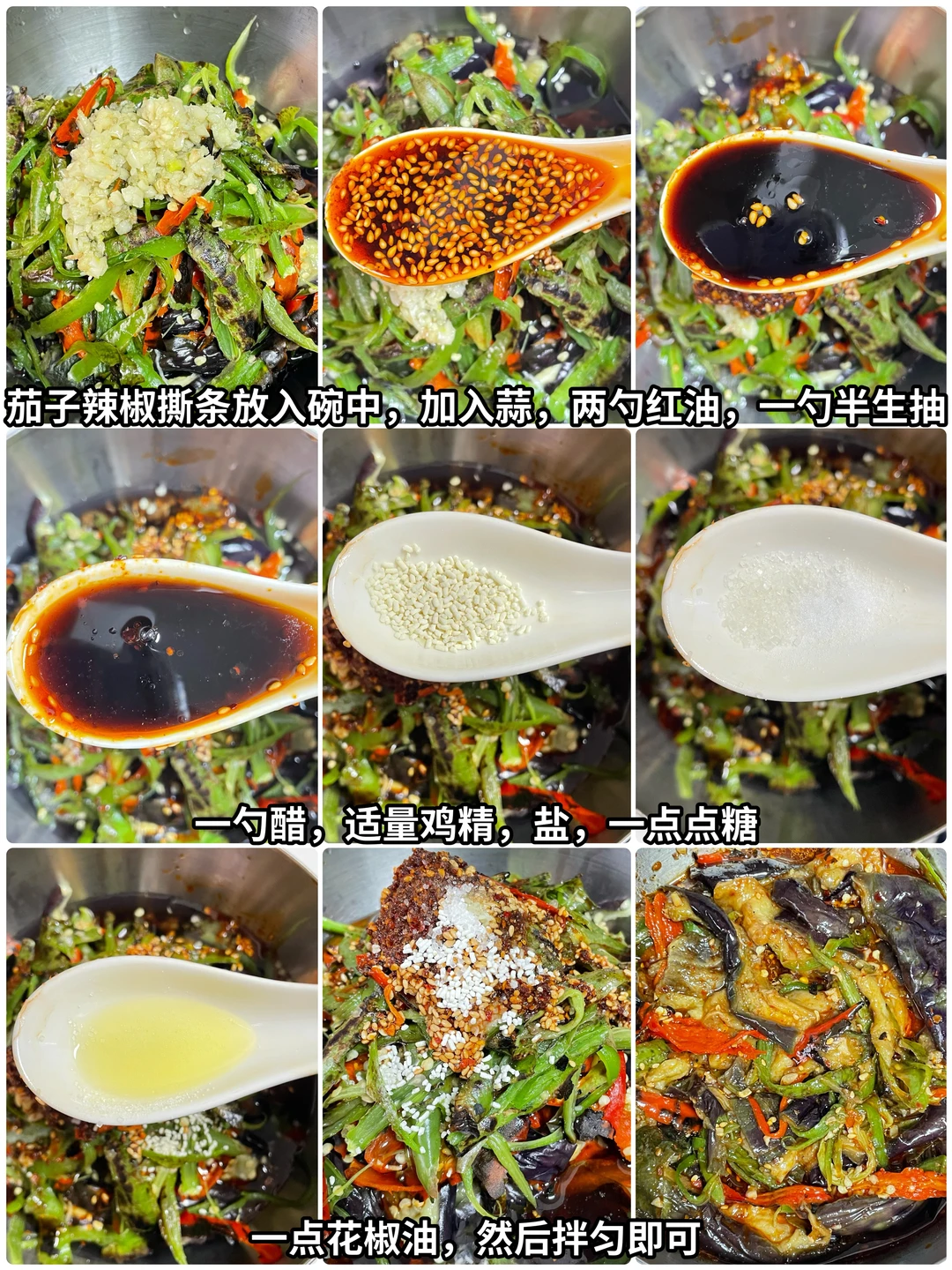 2⃣️将茄子和辣椒还有蒜都放入碗中,加入两勺远老味钵钵鸡调料当红油。老粉都应该知道,这就是这个茄子好吃的关键,然后再放入一勺半生抽,1勺醋,适量的盐、糖、鸡精,一点点花椒油,拌匀即可。这样做成凉拌茄子,真的是可以吃3碗米饭。喜欢的姐妹试试吧
