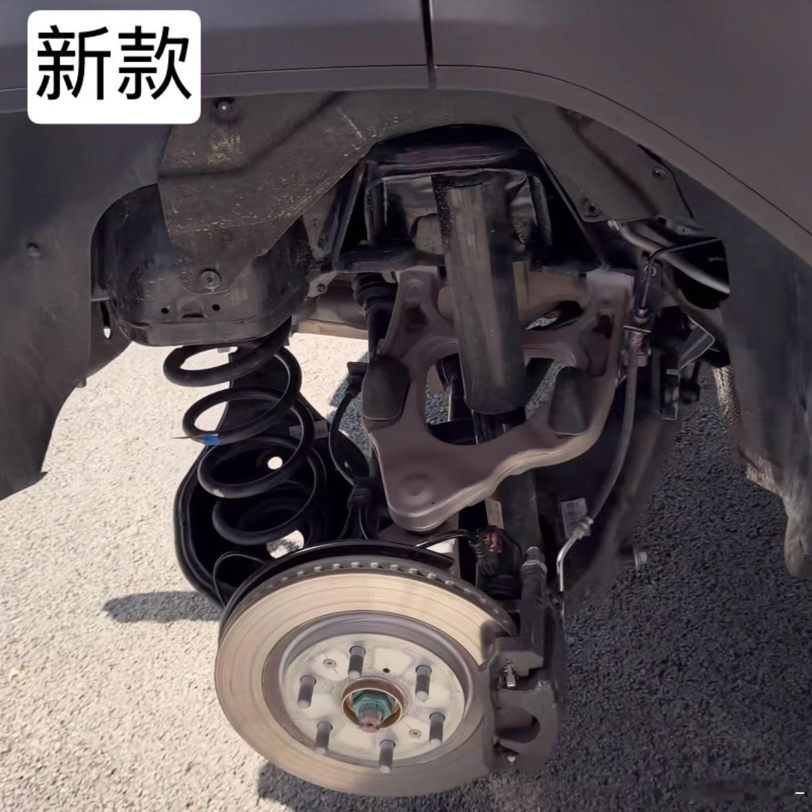 方程豹豹5的底盘不声不响就升级了老款的减振器插在大梁里面,上叉臂安装在大梁上;新款在大梁外侧做了一个减振器塔,上叉臂安装在副车架上。比亚迪