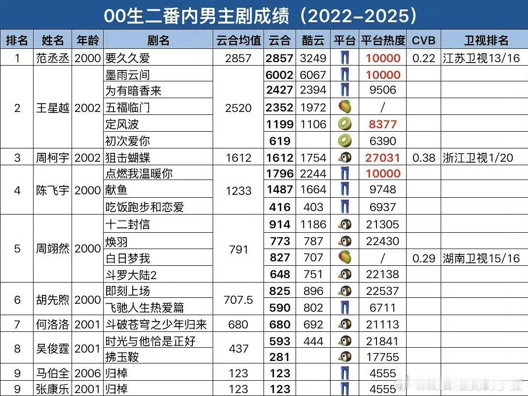 00生男主云合数据拉表前三:范丞丞、王星越、周柯宇