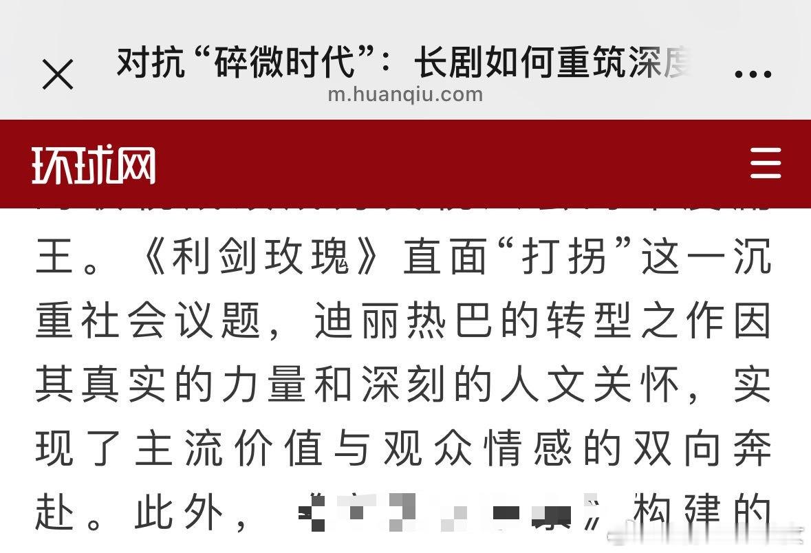 环球网这篇报道夸赞迪丽热巴的《利剑玫瑰》直面“打拐”这一沉重社会议题,用真实的力