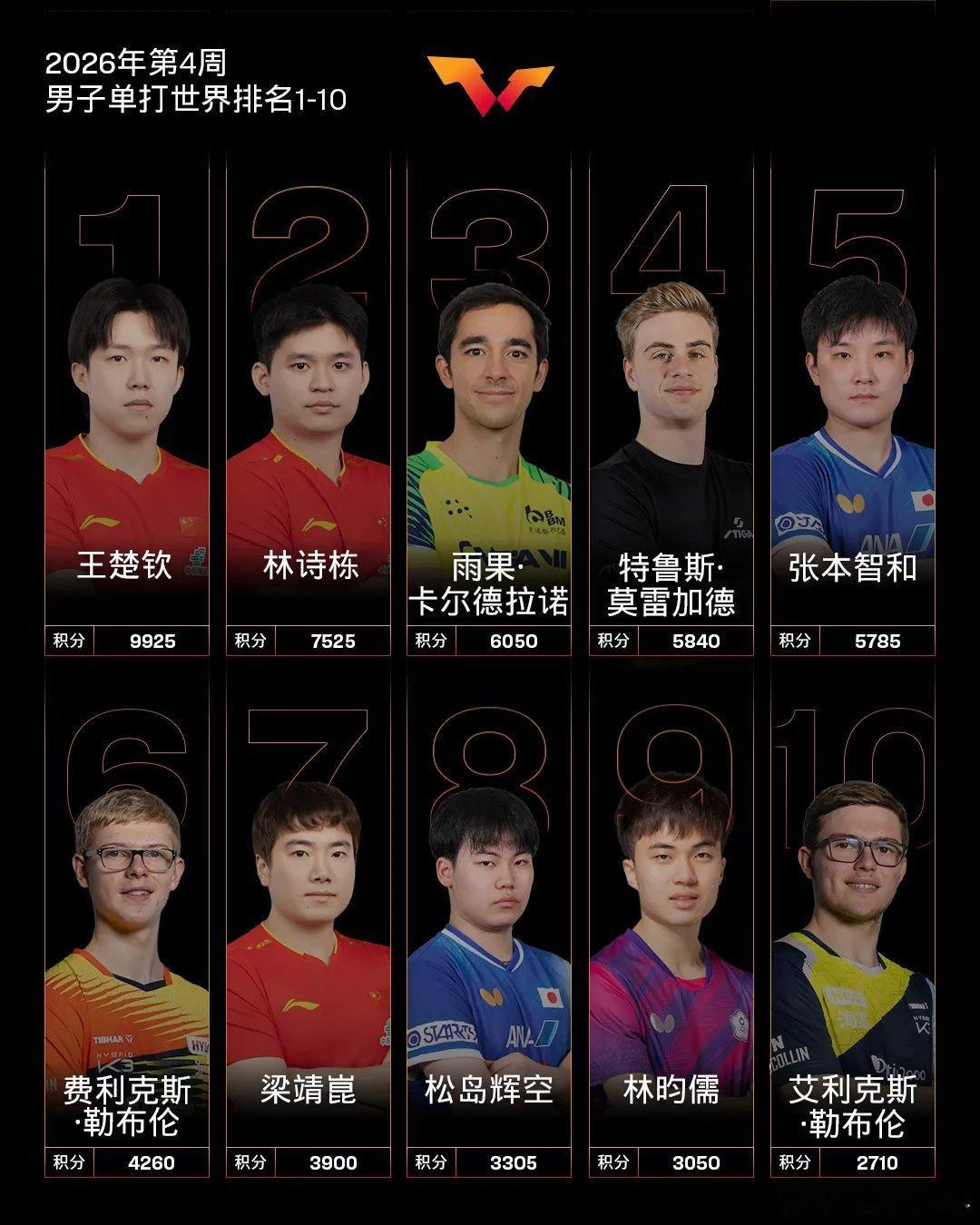 国际乒联2026年第4周世界排名男子单打,中国队球员王楚钦、林诗栋位列前二,梁靖