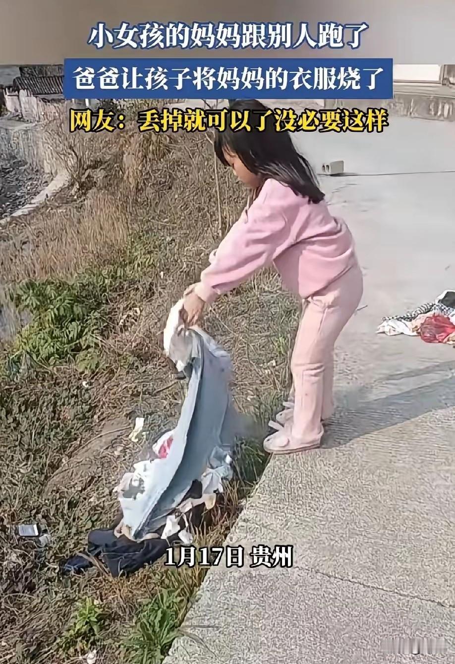 贵州男子因为老婆外出打工后没回家,怀疑跟别人跑了,一气之下让五六岁的女儿把妈妈的衣服拿到门口烧掉。小女孩啥也不懂,爸爸让烧就烧了,根本不知道这是啥意思。 这事传到网上,大家都很生气。有人问:"衣服扔了就行,为啥让孩子烧?"确实,大人闹矛盾,不该让孩子掺和。孩子才五六岁,可能以为妈妈只是去打工,过几天就回来。可爸爸这么一闹,孩子心里得多难受啊! 有人说"清官难断家务事",确实,我们不知道他们夫妻之间到底发生了什么。但要是妈妈真因为"追求爱情"就抛下老公孩子,那确实过分。当妈的不管孩子,让孩子从小没妈疼,这谁受得了?等孩子长大了,很可能恨妈妈。 最可怜的是那个小女孩。她啥都不明白,就被爸爸拉着干这种事。烧衣服对她来说可能就像玩游戏,但以后她知道了,心里肯定不好受。网友说得对:大人吵架,别让孩子遭罪。孩子这么小,就被大人之间的恩怨伤害,以后性格可能受影响。 大人闹矛盾,别把孩子扯进来。有啥问题大人自己解决,别让孩子烧东西、扔东西,或者做其他伤害感情的事。孩子是无辜的,我们要保护他们,让他们健康成长。