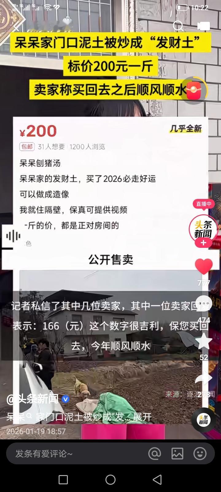 看到新闻,前几天邀请几千人吃刨猪宴的“合川呆呆”爆红之后,她家门前的土都火了。现在她家门前的一块土在网上都炒到200块钱一斤了,太荒谬了。多名自称“呆呆邻居”的卖家将其家门口的普通泥土包装成“发财土”“转运神器”,标价从66.66元到200元一斤,宣称“买了2026必走好运”,甚至承诺现场挖掘、拍视频“保真”。这场闹剧的背后,是网红流量异化与网络迷信的畸形结合,值得所有人警惕。(图片信息来源:头条新闻)合川呆呆 呆呆杀猪宴 合川呆呆妹 重庆网红呆呆 合川刨猪宴 呆呆刨猪宴 吃呆呆家刨汤饭