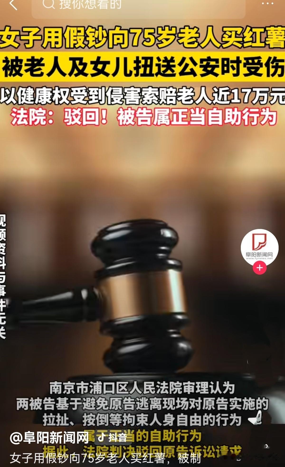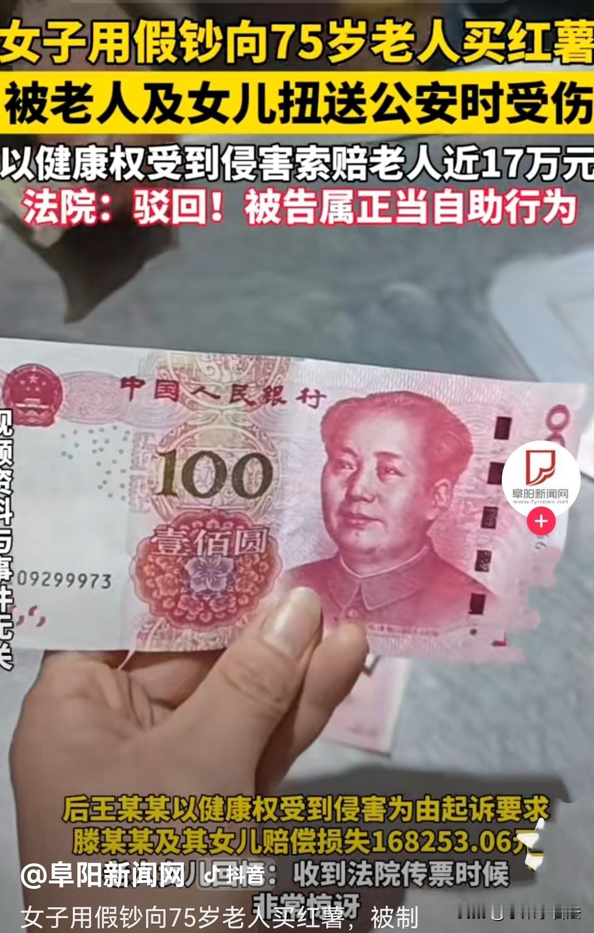 江苏南京,75岁老汉卖红薯,一女子带着口罩和头盔买红薯,老汉看她递过来的百元钞不对劲,想起前两天收的假币,发现对方就是那个骗子,想与女儿一起将她控制,过程中致使女子面部受伤。民警赶到,查实女子非法持有和使用600元假币,将其行政拘留7日。女子反手将老汉父女告上法庭,说他们侵犯了自己的健康权,索要168253.06元赔偿。法院判决大快人心! 75岁的滕老汉是一农民,夫妻俩仍勤勤恳恳种地,他们不光是要靠自己双手养活自己,还有深植于血脉中对土地的眷恋。 滕老汉种植的红薯大丰收,又甜又糯的红薯吃不完,他就与老伴将红薯拉至市场售卖,自家种的没农药化肥,物美价廉,自然受到一些顾客喜欢,很快就卖完了。 老两口很开心,回家一张张捋着大大小小的票子,突然滕老汉拿着一张百元钞愣住了:老婆子,这张好像有问题? 老伴看了半天,有些拿不准,便叫来女儿帮看看。 小滕一看,直接对父母说假的!准是看老实巴交农村老人好欺骗,专门挑你们坑!咋这么坏? 过了两天,2023年2月17日,滕老汉又要去卖红薯,女儿不放心,父母那么大年纪种地也不容易,怕有人再用假币坑父母,于是便随同他们一起去了市场。 上午时分,市场里渐渐热闹起来,滕老汉的红薯仍收欢迎,买过他红薯的老熟客纷纷挑选,赞不绝口。 一个戴着口罩和头盔的女子走到滕老汉摊前,挑了些红薯,随后掏出一张红票子递过来。 滕老汉经历过那一次假币后,一接大票万分仔细,经一事长一智!他左看右看,用手抖了抖,感觉不对劲! 他再抬头看向买主,虽对方捂严实,但看身形和眉眼,突然认出,这女人就是前两天用假币骗他的人! 就是你!上次用假钱骗我!滕老汉又气又急,一把抓住了女子胳膊不让离开。 女子根本不认账,挣扎着想要逃跑。 小滕听见父亲的叫喊,停下忙碌过来帮忙,父女俩想合力将女子控制住,将她扭送公安机关。 干这缺德事还想跑?父女俩拉着她不让跑,在控制过程中,女子拼命挣脱,撕扯中女子的面部不小心受了伤。 周围人也愤愤不平,赶紧帮忙报警。很快民警赶到现场,将双方带回派出所调查。 经过详细核实,民警发现女子王某,她不仅买红薯用假币,还非法持有假币累计金额高达600元。 《治安管理处罚法》第72条‌规定:对明知是伪造的货币而持有、使用的行为,若情节轻微,可处‌5日以上10日以下拘留‌,并处‌500元以下罚款‌。 王某使用和持有假币违反了国家金融管理,民警依法对王某作出了行政拘留7日处罚。 本以为事情到这儿就结束了,可万没想到,王某拘留结束后,竟以健康权受到侵害为由,将滕老汉父女儿告上了法庭,索要168253.06元赔偿。 滕家人都懵了,她用假币骗人,控制她时碰伤,又没打她,她怎么还倒打一耙?真是岂有此理! 这场突如其来的诉讼,让原本平静的家庭陷入了焦虑,尤其是75岁的滕老汉,年纪大了经不起折腾,心里一直惦记着这事,寝食难安。 庭审中,王某坚持认为滕老汉父女的行为造成了自己面部受伤,应当承担赔偿责任。 而滕老汉父女辩称,他们只是为了制止王某防止她逃跑,属于正当维权,不应该赔偿。 《民法典》第1177条规定:合法权益受到侵害,情况紧迫且不能及时获得国家机关保护,不立即采取措施将使其合法权益受到难以弥补的损害的,受害人可以在保护自己合法权益的必要范围内采取扣留侵权人的财物等合理措施。 本案中,王某使用假币购买滕老汉的红薯,不仅侵害了滕老汉的合法财产权益,还破坏了国家金融管理秩序。 而滕老汉父女发现王某使用假币且意图逃跑,为追回钱款,采取拉扯、按倒等方式控制王某的人身自由,目的是阻止其逃跑,并未对其实施殴打等过激行为,措施在必要范围内,未超出合理限度。 最后,他们在控制住王某后立即报警,完全符合自助行为的要求。 因此,滕老汉父女的行为属于合法的自助行为,无需承担侵权责任。 《民法典》第1174条规定:损害是因受害人故意造成的,行为人不承担责任。 本案中,滕老汉父女没侵害王某健康权的主观过错。 他们的目的是制止王某使用假币的违法行为,防止其逃跑,维护自身合法权益,并非故意要伤害王某。 其次,王某的面部受伤是在滕老汉父女拉扯其,防备她逃跑过程中意外造成的,并非他们刻意为之。 王某因自身违法行为导致受伤,其自身存在重大过错。因此,王某主张的健康权侵权并不成立,滕老汉父女无需承担赔偿责任。 最后法院作出判决:驳回原告王某的全部诉讼请求。 在2024年12月31日接到判决书,这日正是滕老汉的生日!小滕说起当时的情景,忍不住红了眼眶:我们父女激动的拥抱在一起!心里的石头总算落了地!这是我爸最好的礼物! 滕老汉在2025年4月不幸去世,女儿说这事让他心神不宁,急火攻心,在生病期间,他还一直挂念着这起案件,还好法律给了他公正,他未遗憾离去! 对此您怎么看?
