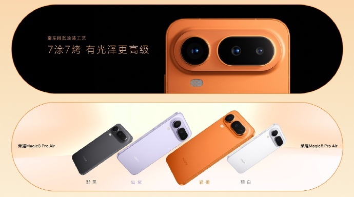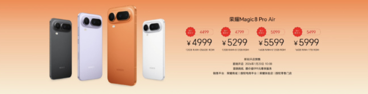 荣耀发布会荣耀Magic8 Pro Air来啦,给大家来个课代表价格:12+256,4999元;12+512,5299元;16+512,5599元;16+1TB,5999元颜色:轻橙、仙紫、羽白、影黑四色机身:重量为155g、厚度为6.1mm影像:5000万大底主摄+5000万超广角+6400万潜望长焦,支持全焦段4K录像与AI变焦阵列闪光灯,支持CCD爆闪人像模式电池&续航:搭载5500mAh青海湖电池,支持80W有线+50W无线快充性能:搭载天玑9500,配备3D超声波指纹、立体双扬、IP68/69防水及eSIM+实体卡四卡双待