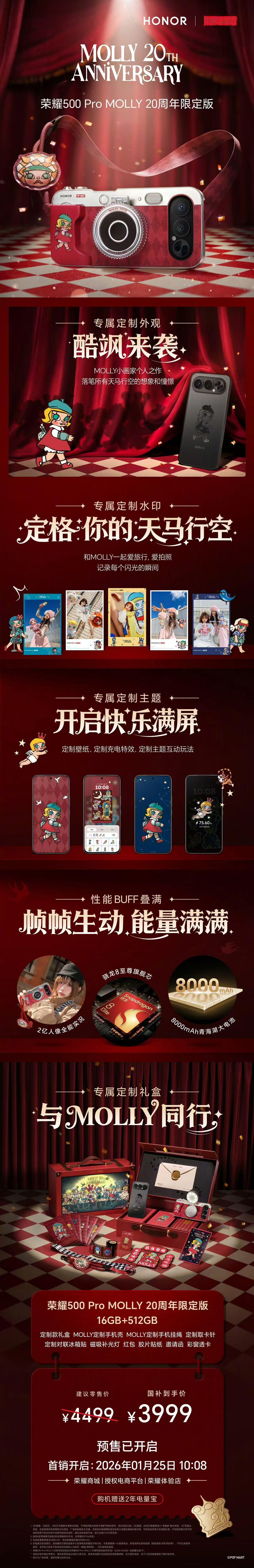 荣耀Magic8 Pro Air:12GB+256GB:4999,12GB+512GB:5299,16GB+512GB:5599,16GB+1TB:5999。荣耀Magic8 RSR保时捷设计:16GB+512GB:7999,24GB+1TB:8999。荣耀50 Pro MOLLY 20周年限定版:16GB+512GB:4499(国补到手3999)。冲不冲?