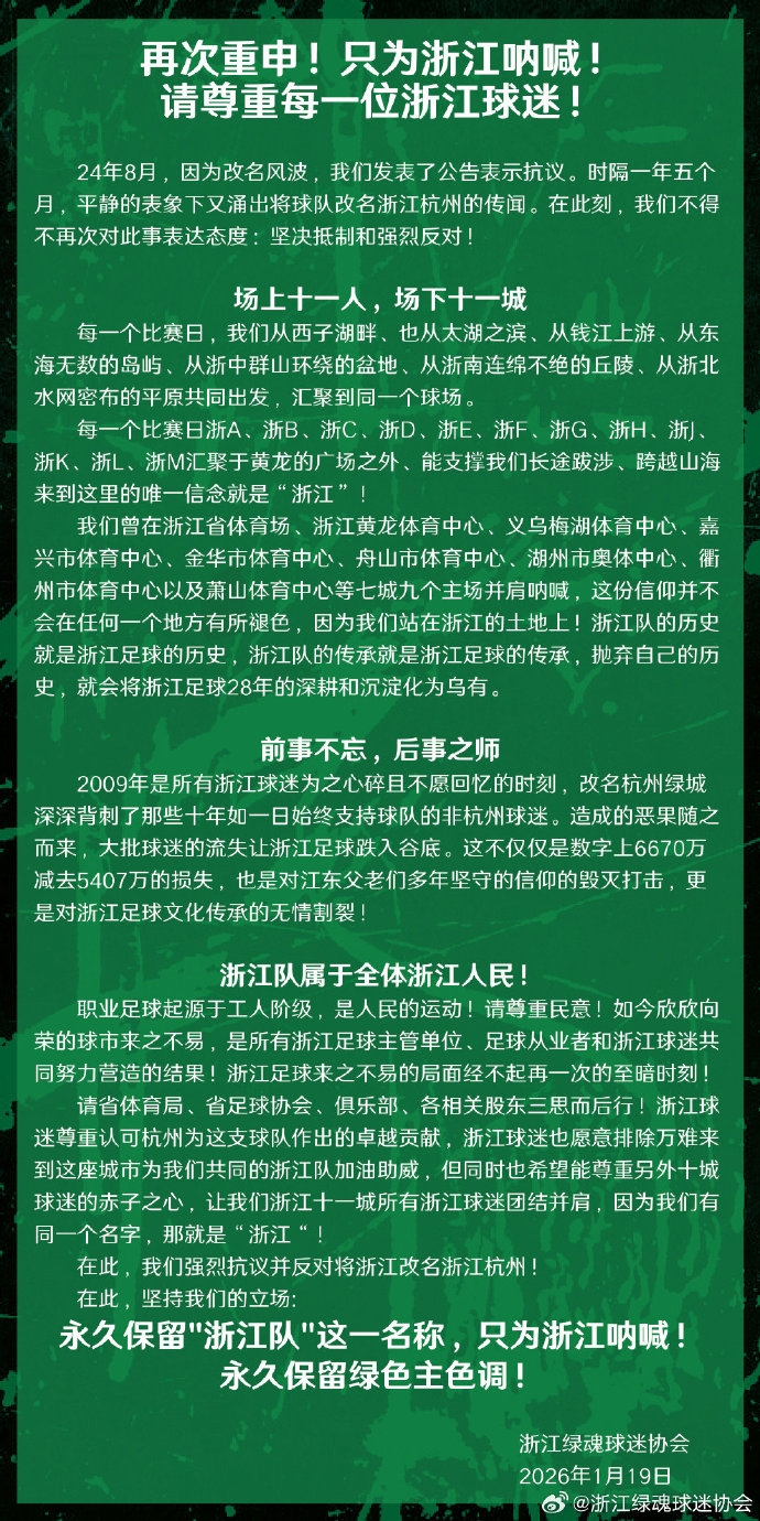 浙江队传闻更名浙江杭州 浙江绿魂球迷协会:坚决抵制 强烈反对!