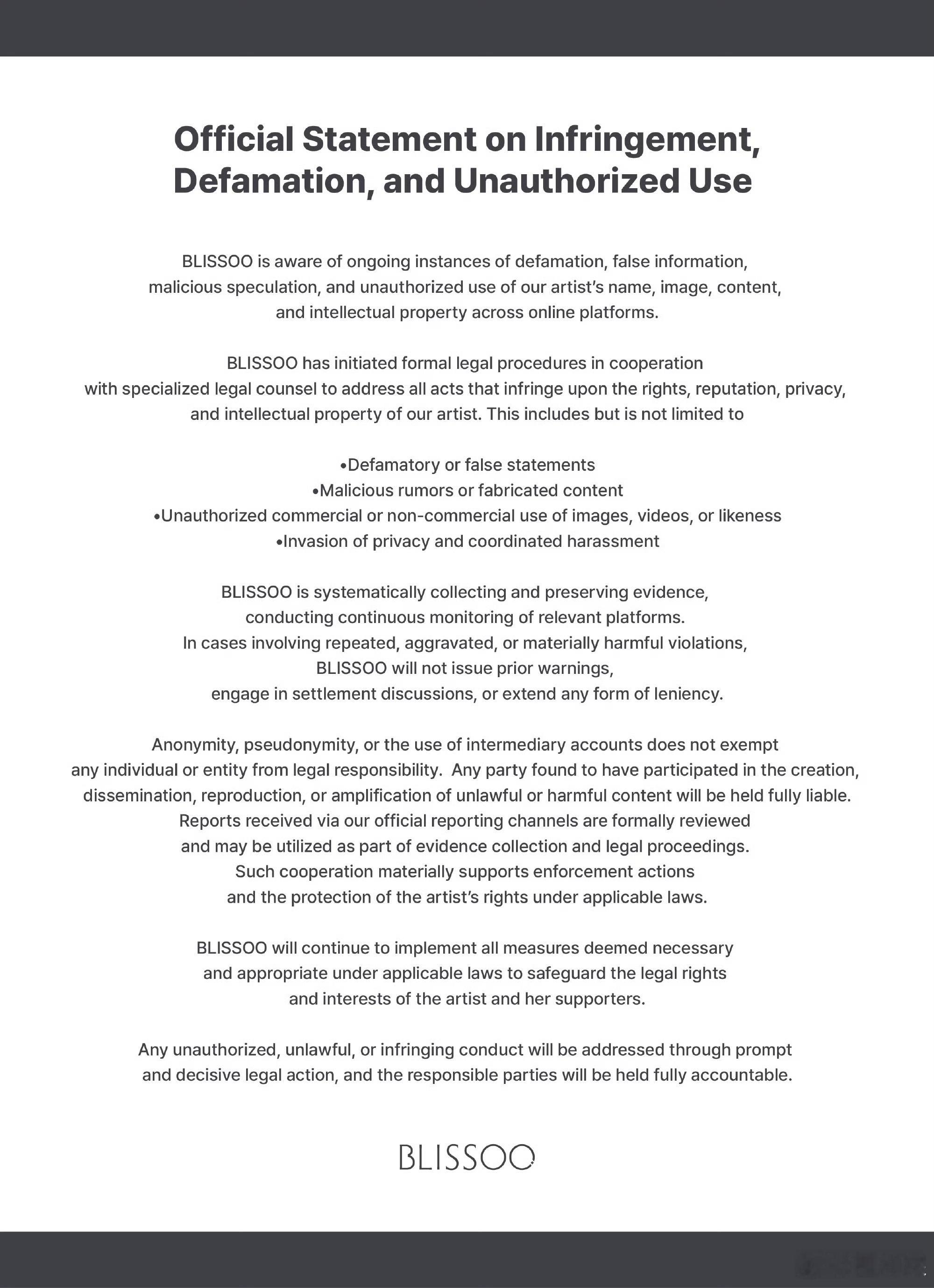 金智秀公司告黑 【BLISSOO 将不再事先发出警告,不进行任何形式的和解协商,亦不会给予任何宽待。】就是要这个态度