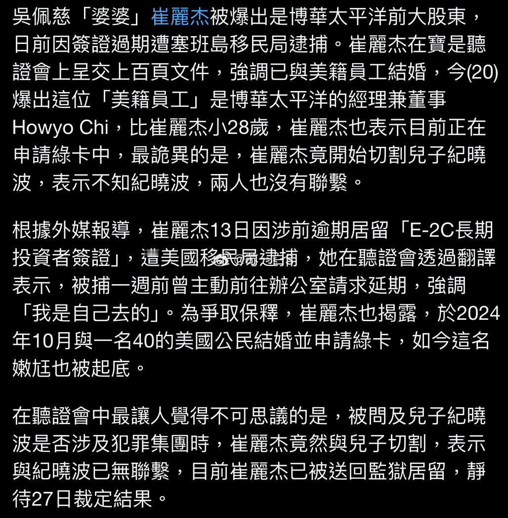 跟进下吴佩慈“婆婆”被ICE逮捕的新闻(👉网页链接)她的律师为了争取保释,递交了长达173页的证明文件,其中透露了她在2024年10月跟一位40岁的美国公民结婚(小她26/27/28岁,不同新闻说的数字不同),并申请了绿卡,这位名叫Howyo Chi的美国人曾任职于博华太平洋国际公司,担任董事/经理一职,而这家公司的大股东正是崔丽杰。(查了下,图二:2025年3月就有媒体报道了Howyo Chi和崔丽杰再婚的新闻了,说他从2017年起在博华太平洋国际工作,疫情之后公司大部分员工都被解雇了,但他仍保留经理/董事的职位,他跟崔丽杰于2024年10月18日在塞班岛结婚)被问及是否了解儿子纪晓波的踪迹时,崔丽杰回答“我跟他没有关系”,声称两人早已断联……