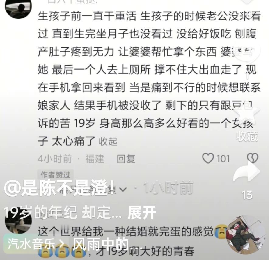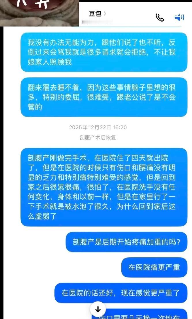 那个19岁剖腹产大出血月子里去世的产妇真是太老实了,在婆家被冷落成这样了,还在问豆包如果不经过婆家同意被娘家人接走会不会犯法,傻孩子都在魔窟里了还不快逃,还在问自己有没有罪。 这不是被疏忽照顾,简直就是虐杀,19岁刚做了剖腹产最虚弱的产妇,居然无人照料,上厕所大冬天还要去室外带台阶的厕所上,被切断和外界的联系,疼成那样了不敢说一句,只能和虚拟的豆包说,真是太让人心疼了。 也许她的娘家也不是她想的那样爱她,就像卖火柴的小女孩一样流落街头做着被奶奶接走的美梦,产后娘家也不来探望,也不联系,只认为嫁出去的姑娘泼出去的水一样让人寒心。 之前婆婆在我面前说她妹妹吐槽她家儿媳妇不会照顾孩子,如何如何邋遢,要知道她家儿媳妇也不满二十岁,我直接说刚生了孩子她的年龄也不大,做婆婆的就不能多照顾一下吗。 不管得罪不得罪人,真的看不得年轻的小媳妇被老江湖的婆婆磋磨。