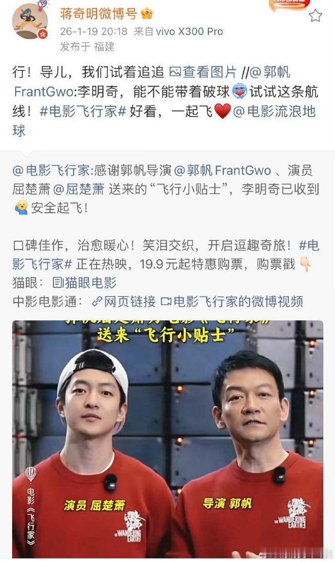 郭帆屈楚萧给蒋奇明打call 不少观众看完这波互动都被狠狠拿捏了,本来就很期待蒋奇明的新片《飞行家》,现在还有了郭帆和屈楚萧的强势打call!