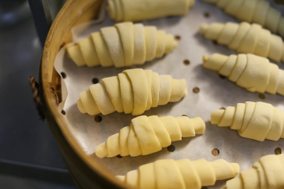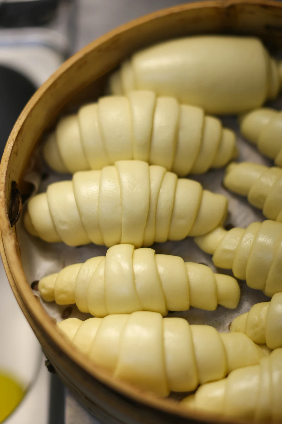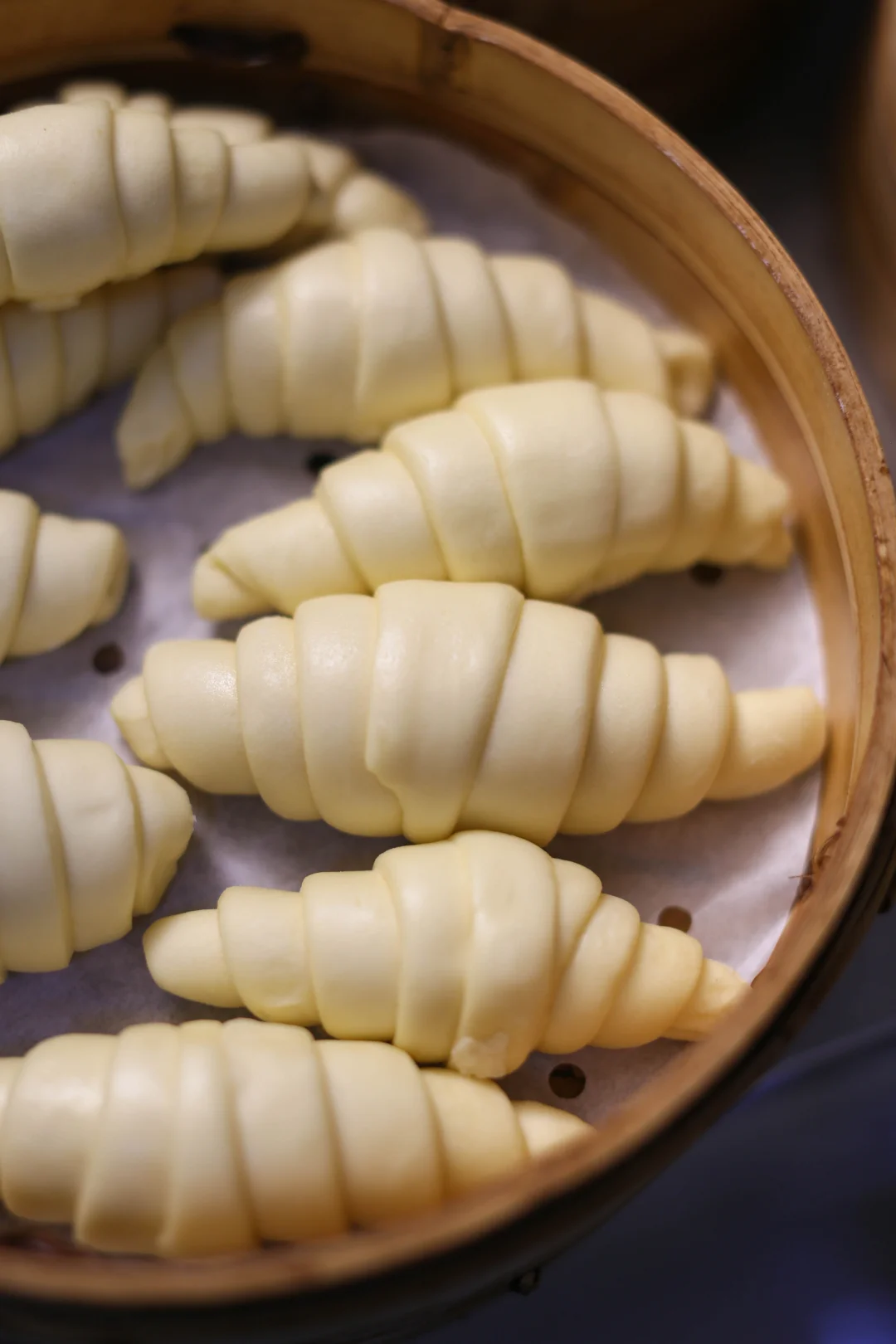 掀开锅盖的刹那,乳白的蒸汽携着纯粹的麦香与奶香,扑面而来。牛角馒头们泛着柔和的象牙白光泽,表皮光滑,身形饱满。趁热拿起一个,手感是轻盈的蓬松。
