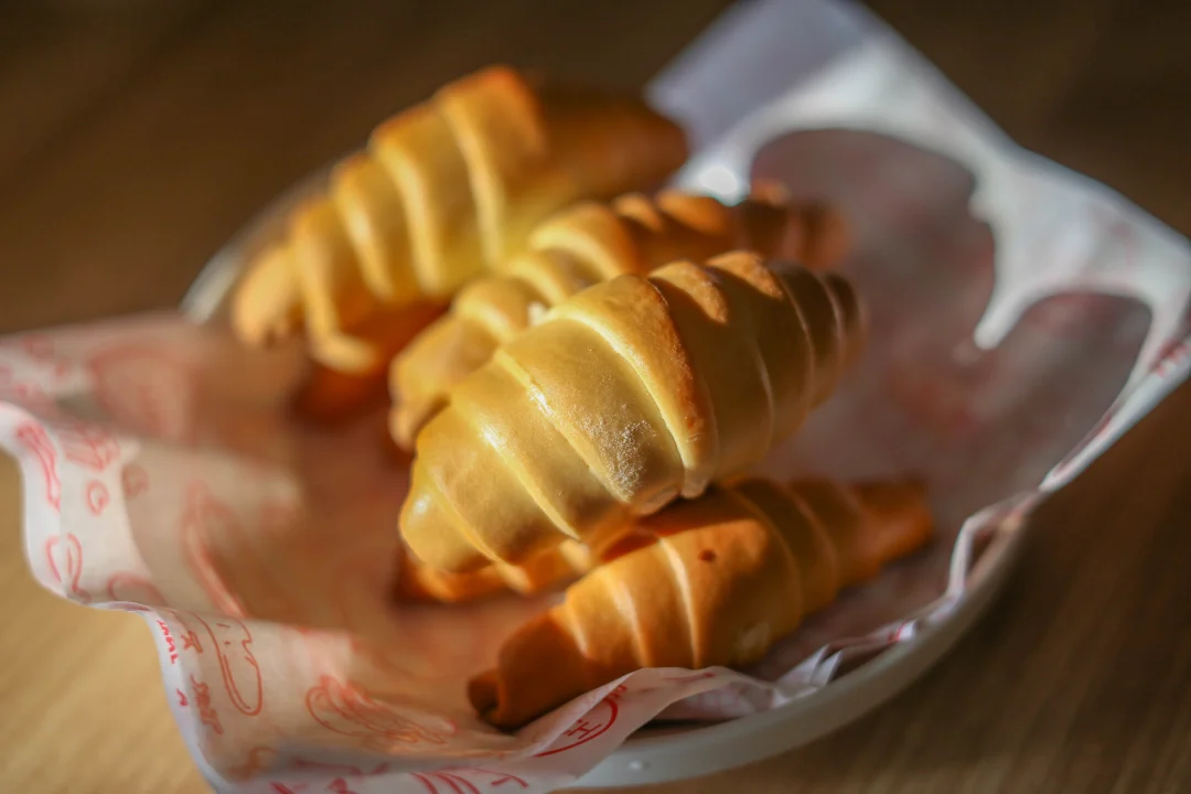 的弧度——一个胖乎乎的牛角雏形,放在室温25度左右的地方,盖上沾布继续饧发30分钟。