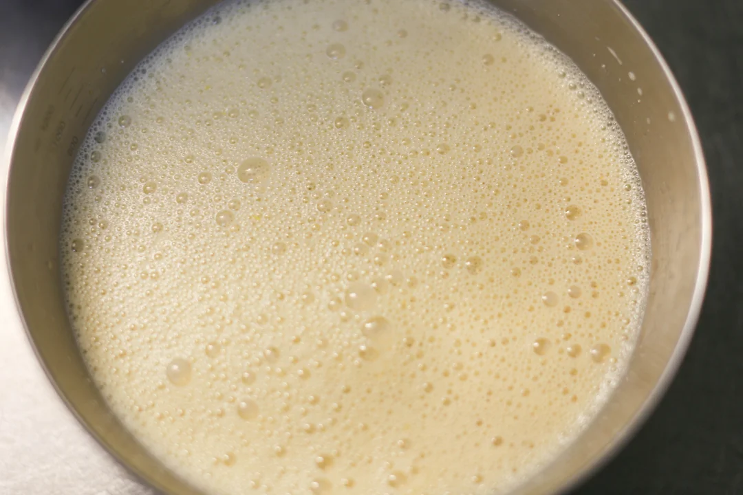 3:饧发大约30分钟,有明显的蜂窝状就可以,因为是牛奶和面,不会发的那么大。
