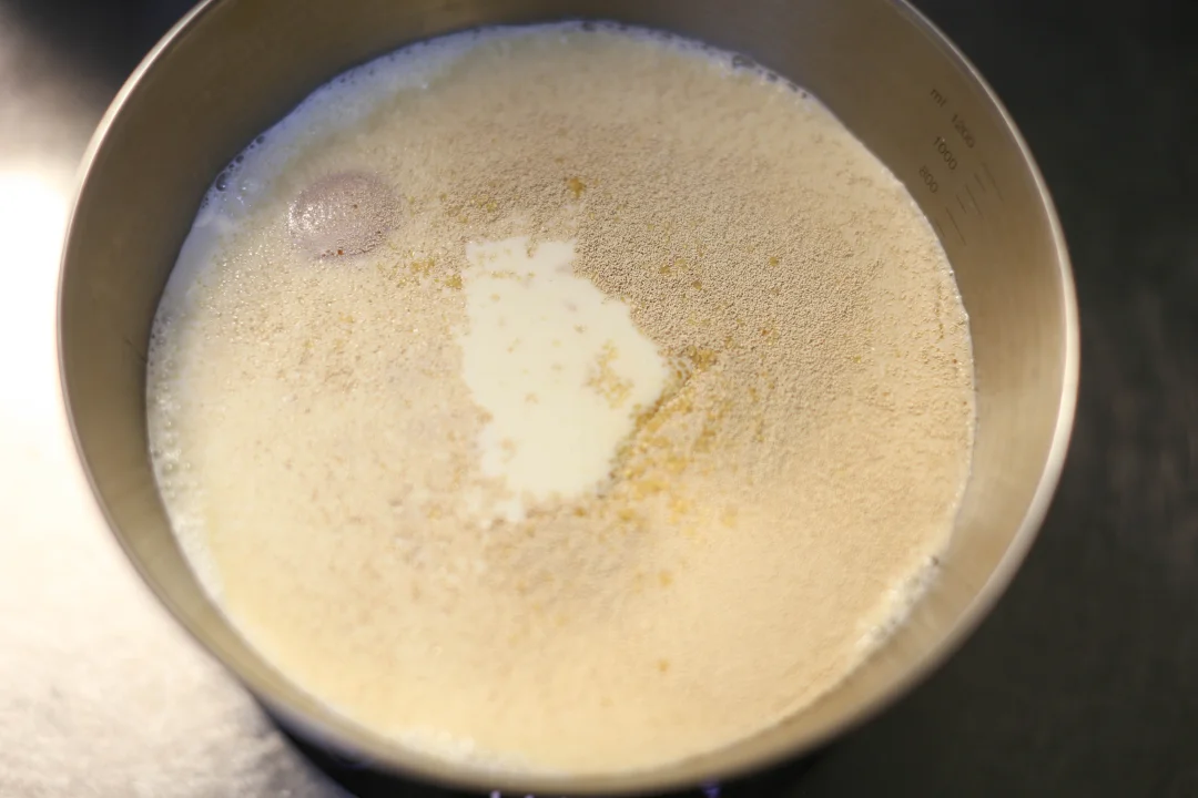 1:把酵母20克、牛奶500克、白糖100克放入牛奶中,混合成酵母水。