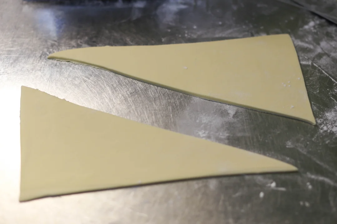 5:擀成长方形 ,自己算好尺寸,切割成等腰三角形,从三角形的底边开始,轻轻卷起,向着那个尖尖的角推进。手劲要匀,要稳,让面皮一层贴着一层,卷出紧实而从容的螺旋。最后,把尖端压在底部,顺势弯出那道优雅