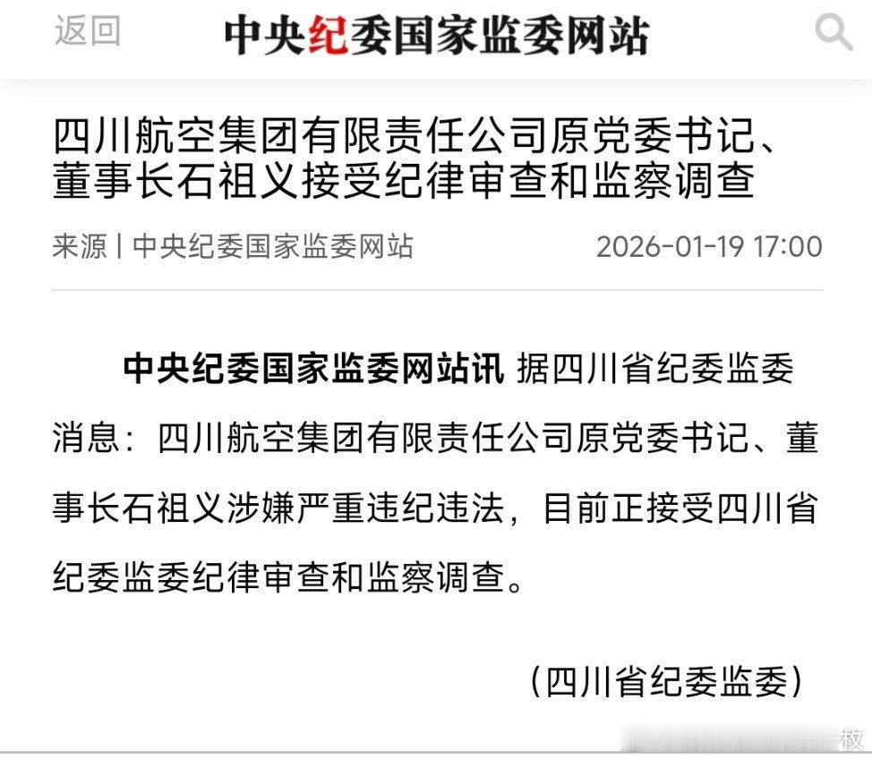 四川航空集团有限责任公司原党委书记、董事长石祖义接受纪律审查和监察调查。值得注意