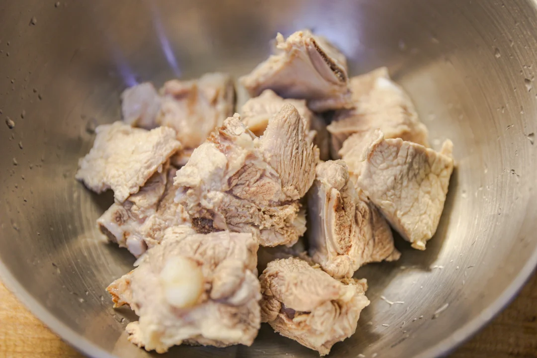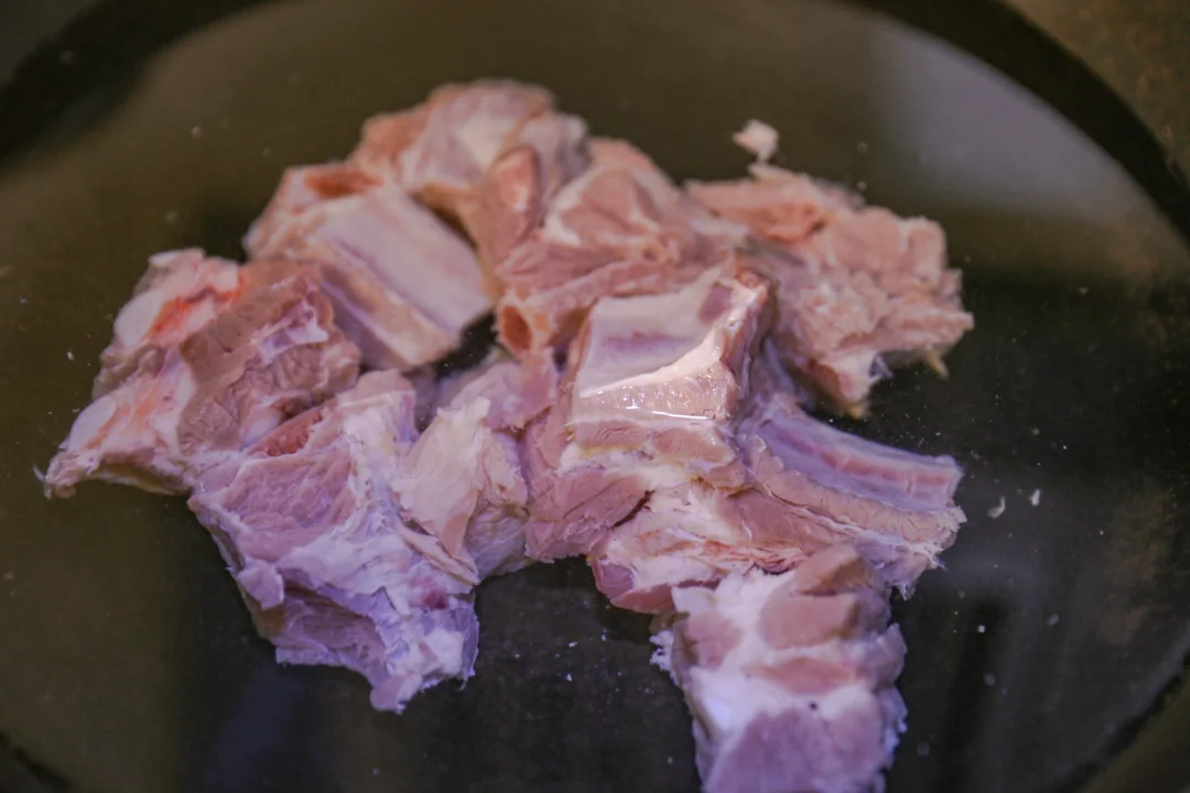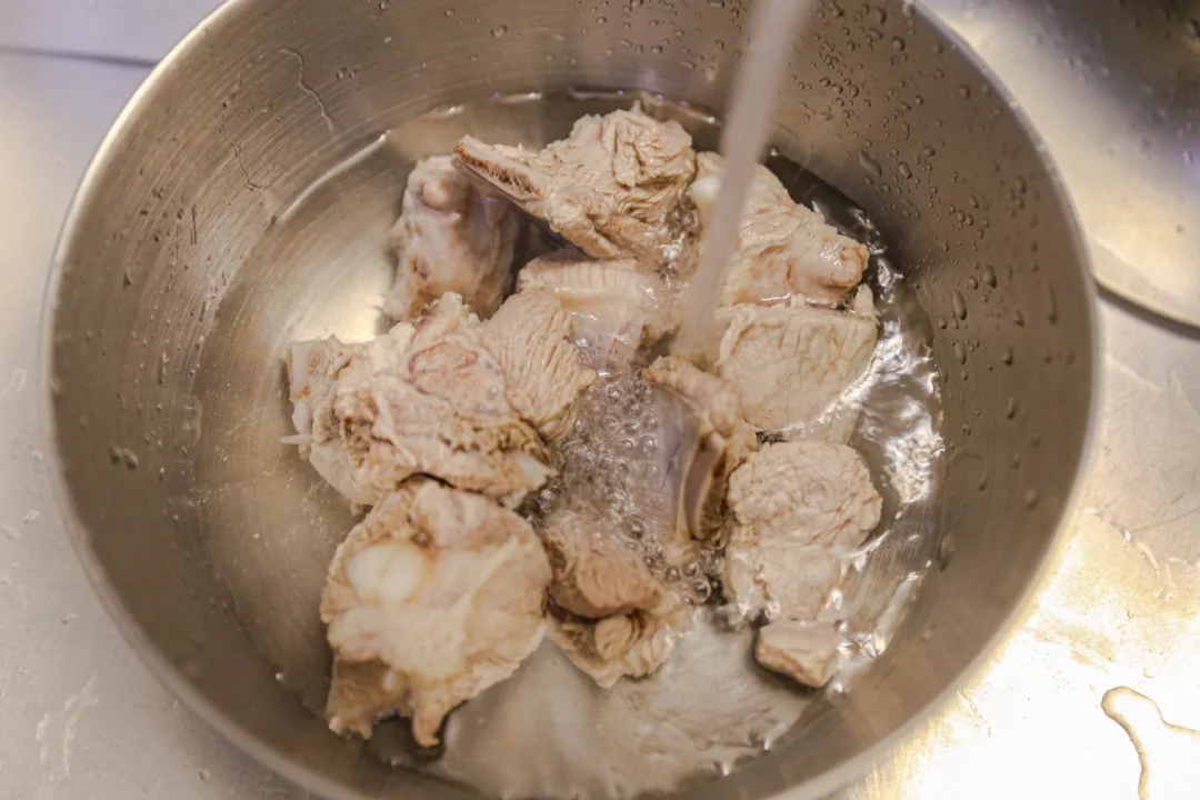 1.新鲜的肋排清洗干净之后,放入冷水锅中,加黄酒适量去腥,滚开之后煮3-4分钟,撇去浮沫,温水清洗干净。