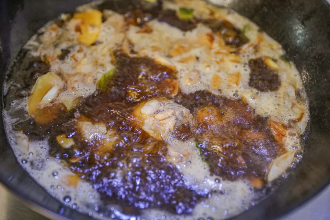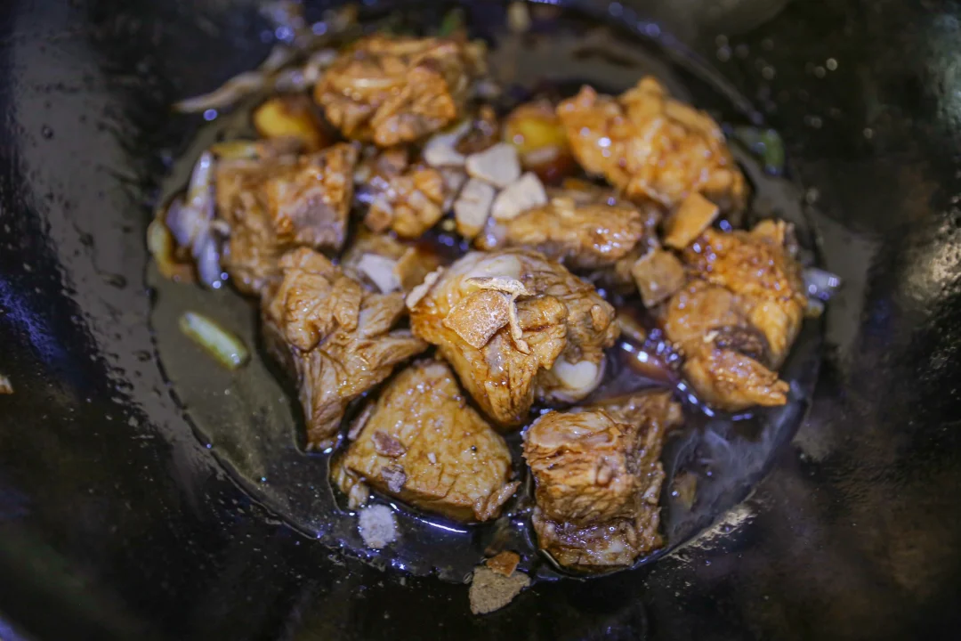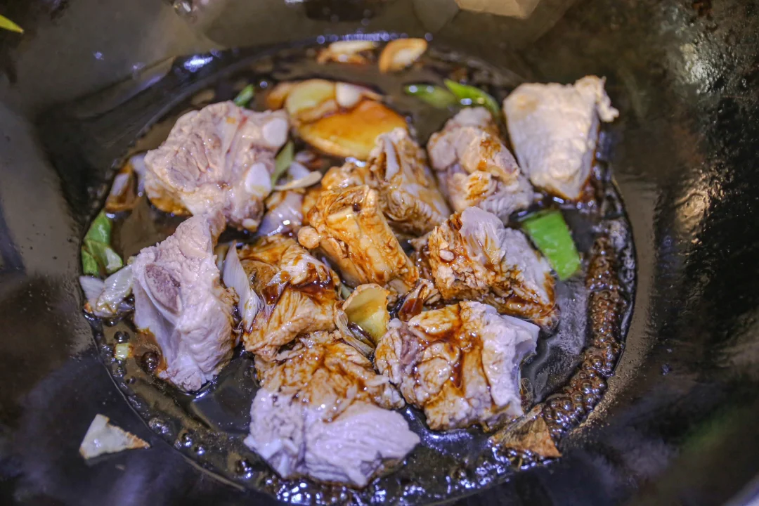 3.炒出香味之后,加入没过排骨2倍的热水。,如果时间来得及,就转小火慢炖30分钟。如果时间来不及可以用高压锅,大约压10分钟左右。