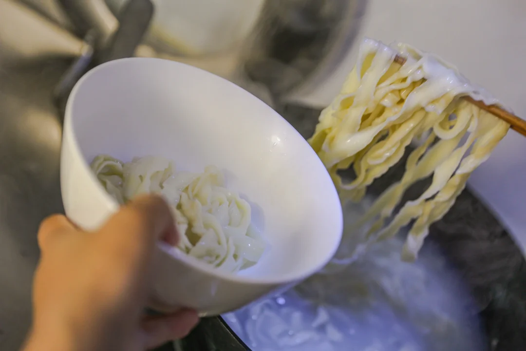 5.鲜面条加入沸水中煮熟后,加入菠菜,装入碗中。