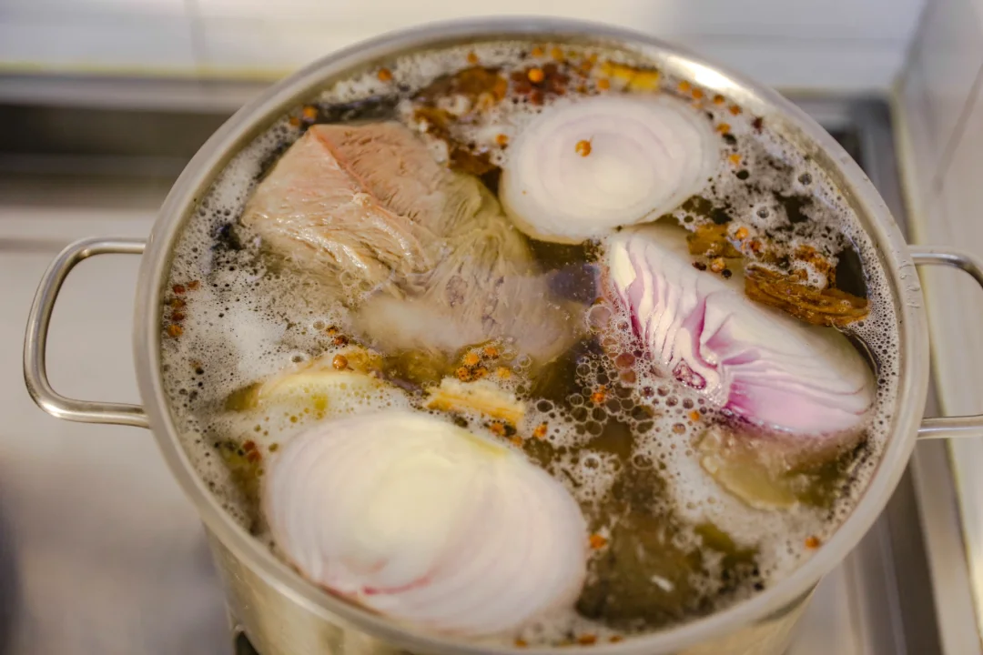 把汆烫过的牛腩和牛杂放入容器中,加入清水,放入甘草、山奈、当归、黄耆、八角、花椒粒、白芷、白胡椒粒,、洋葱、白萝卜、胡萝卜、老姜、葱、 红标料理米酒、食盐,大火烧开,小火慢炖90分钟。等到60分钟的时候,把肉捞出来,否则时间太久,肉的口感就不是很好了。