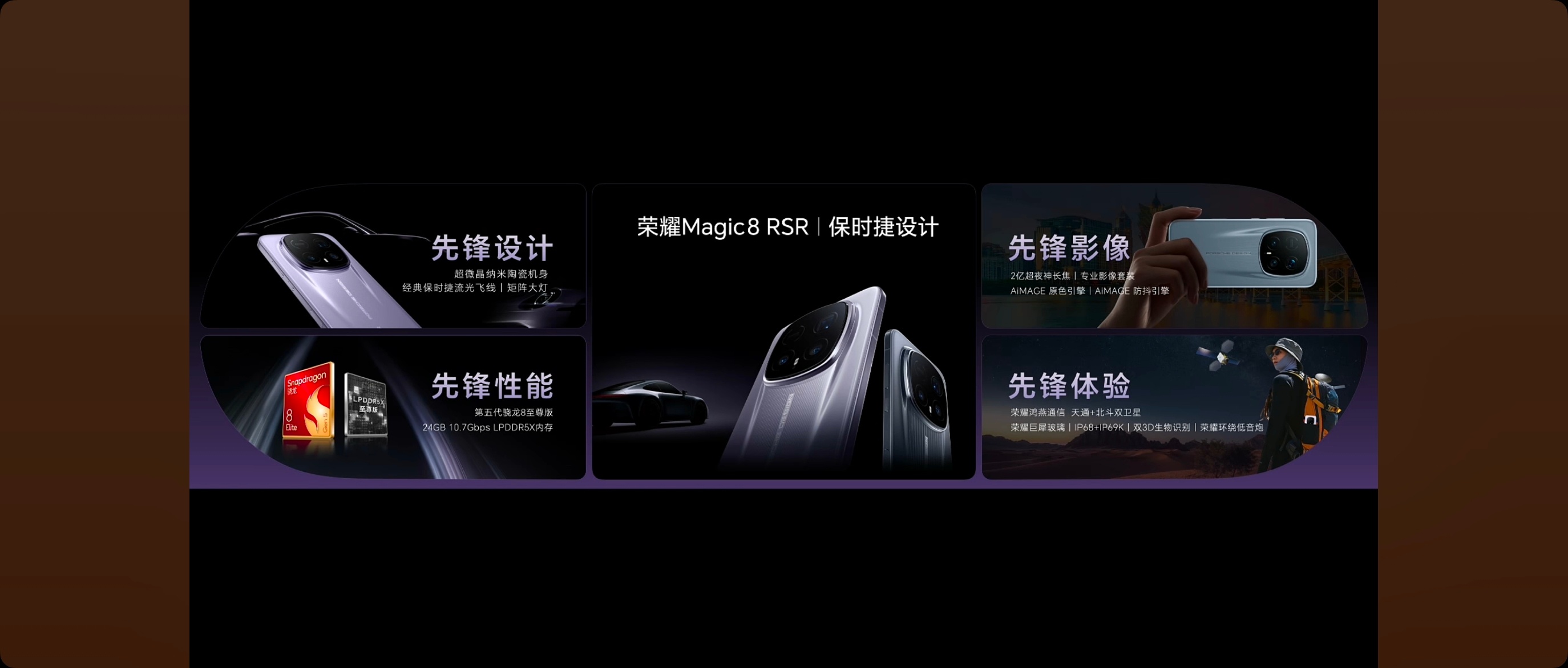 【荣耀Magic8 RSR保时捷设计正式发布:7999元起,荣耀冲击高端的最强旗舰】搭载第五代骁龙8至尊版芯片,配备24GB LPDDR5X内存,内置第二代自研卫星芯片,支持天通与北斗双卫星通信,搭载2亿像素夜神长焦、5000万像素超夜神主摄。并推出摄影增距镜套装。荣耀发布会荣耀Magic8