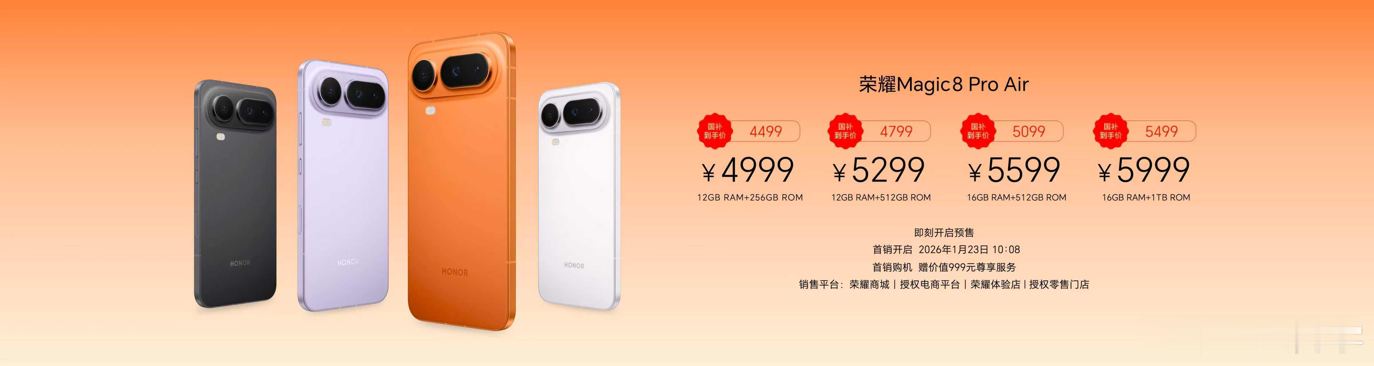 荣耀Magic8 Pro Air手机,国补后4499元起售新品秉持“Pro in the Air”理念,打破轻薄与性能不可兼得的行业认知,以155g重量、6.1mm厚度成为年度最轻旗舰,搭配6.31英寸极窄四等边屏,握持感轻盈舒适。设计上,该机拥有四款配色,电池盖采用7涂7烤光感叠涂工艺,兼具金属缎光质感;首发蝉翼架构与航空铝中框,配备巨犀玻璃,支持IP68&IP69双防水认证,轻薄且耐用。影像方面,搭载全焦段Pro级三摄,含5000万大底主摄、6400万潜望长焦及5000万超广角,搭配安卓首个AI变焦阵列闪光灯,AI功能加持下可拍出质感大片。性能与续航同样出色,内置天玑9500旗舰芯片,搭配5500mAh青海湖电池,支持80W有线+50W无线快充,告别电量焦虑。屏幕搭载荣耀绿洲护眼技术,支持4320Hz超高频调光,还具备四卡双待、3D超声波指纹等功能,全维度展现Pro级实力,满足年轻用户对轻盈生活与强大性能的双重需求。