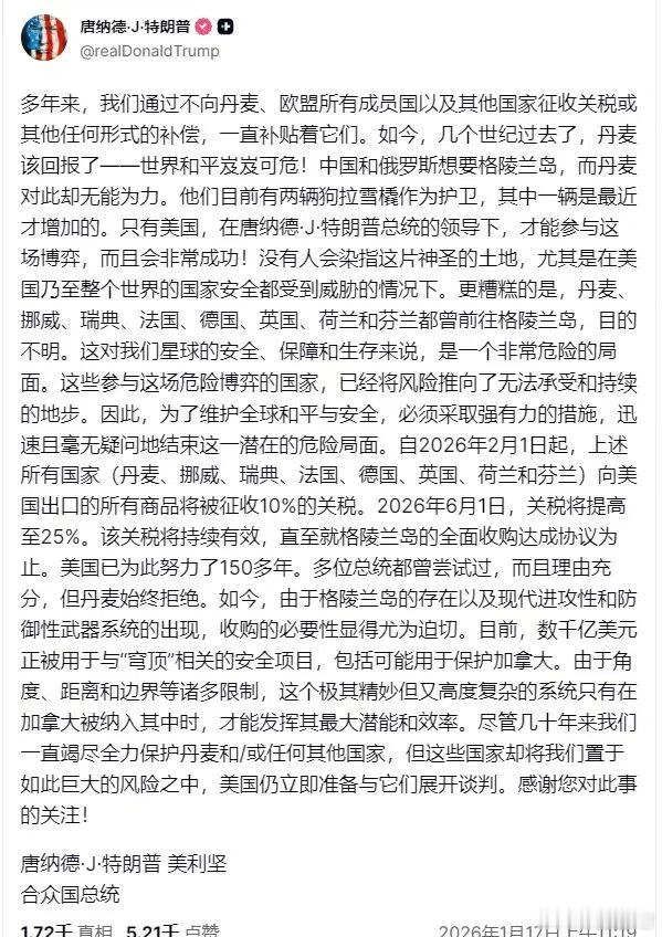 爆炸性突变:美欧加速滑向敌对!美国与欧洲几代人从未有过的尖锐冲突正式爆发了。特朗普美国时间周六宣布向丹麦,以及7个向格陵兰岛派兵的欧洲国家征收惩罚性关税,并称,它们将延续到美国就格陵兰岛的全面收购达成协议为止。这是特朗普把吞并格陵兰岛半公开半模糊的主张正式作为美国的国家决定摆到了台面上,并且不再是协商式,而是公然胁迫欧洲。这是自北约成立以来大西洋两岸第一次不可调和的公开敌对,而且目标是美国对欧洲一块领土的吞并。“我们谈的是收购,不是租赁,也不是短期持有。”特朗普上周日乘坐“空军一号”返回华盛顿时说。▲海鸥飞越格陵兰岛努克古城。(图源:路透社)美欧在冷战结束后多次出现分歧,从波黑战争到伊拉克战争,再到乌克兰战争,还有贸易战,等等,但那些都是分歧,顶多是裂痕。但是特朗普要吞并格陵兰岛,并且强硬制裁丹麦和支持丹麦的7个欧洲国家,这是吞并和反吞并的零和对抗,是迈向敌对的重要一步。事件的起因是丹麦邀请英法德等7个国家一起赴格陵兰岛参加“北极耐力”联合军演。为了降低敏感性,丹麦同时也邀请了美国。除了丹麦之外,那7个欧洲国家总共派出37人:法国15人,德国13人,瑞典3人,挪威2人,芬兰2人,荷兰1人,英国1人。但是特朗普非常愤怒,他在社交媒体上发帖说,“更糟糕的是,丹麦、挪威、瑞典、法国、德国、英国、荷兰和芬兰都前往格陵兰岛,目的不明。这对我们星球的安全、保障和生存来说,是一个非常危险的局面。这些参与这场危险博弈的国家,已经将风险推向了无法承受和持续的地步。因此,为了维护全球和平与安全,必须采取强有力的措施,迅速且毫无疑问地结束这一潜在的危险局面。”特朗普还指控丹麦在过去几个世纪里享受了美国的补贴,他写道,“多年来,我们通过不向丹麦、欧盟所有成员国以及其他国家征收关税或任何其他形式的报酬,一直补贴着它们。如今,几个世纪过去了,丹麦该回报了——世界和平岌岌可危!”他还嘲笑丹麦,“他们目前有两辆狗拉雪橇作为护卫,其中一辆是最近才增加的。”▲在美国总统威胁要吞并格陵兰岛之际,抗议者在丹麦首都哥本哈根举行示威活动,声援格陵兰岛。(图源:盖蒂图片社)特朗普还重申格陵兰岛在军事上的重要性,他写道,“如今,由于格陵兰岛的存在以及现代进攻性和防御性武器系统的出现,收购的必要性显得尤为迫切。目前,数千亿美元正被用于与‘穹顶’相关的安全项目,包括可能用于保护加拿大。”特朗普悍然宣布将从2月1日起,对他点名的8个欧洲国家向美国出口的所有商品征收10%的关税,6月1日起,关税将增至25%。“该关税将持续有效,直至就格陵兰岛的全面收购达成协议为止。”特朗普的宣告相当于晴天霹雳,欧洲惊骇,又气又怕。各国领导人的反应在当地时间周六晚上迅速做出。其中,法国总统马克龙的表态最强硬,称特朗普的威胁“不可接受”。马克龙说:“任何恐吓或威胁都无法影响我们,无论是在乌克兰、格陵兰岛,还是在世界其他任何地方,当我们面临类似情况时,都不会屈服。关税威胁是不可接受的,在当前形势下毫无立足之地。如果关税威胁成真,欧洲人将团结一致、协调一致地予以应对。我们知道如何维护欧洲主权。”▲周六,大批民众在格陵兰岛首府努克抗议美国接管格陵兰岛。(图源:盖蒂图片社)英国首相斯塔默也表达了类似观点,尽管语气相对缓和。他在一份声明中说:“为了维护北约盟国的集体安全而对盟国征收关税是完全错误的。”挪威首相施特勒表示,盟友之间不应存在威胁。瑞典首相克里斯特松表示,瑞典不会被“勒索”。芬兰总统斯图布则表示,伙伴之间的问题最好通过讨论解决,而不是施加压力。欧盟委员会主席冯德莱恩和欧洲理事会主席科斯塔有意缓和美欧冲突,两人在一份联合声明中强调了对话的重要性,但他们也不得不维护欧洲的基本立场。联合声明指出:“关税将破坏跨大西洋关系,并可能导致危险的恶性循环。欧洲将继续保持团结、协调,并致力于维护其主权。”科斯塔还单独表示,针对美国对欧洲8国加征关税的措施,正在协调欧盟成员国发起联合反制。但是,欧盟外交与安全政策高级代表卡拉斯却把事情往中俄头上扯,声称美国这样做,“中国和俄罗斯肯定乐坏了”。卡拉斯的表态反映出欧洲一些人仍抱有幻想,希望唤醒特朗普和其支持者“西方是一伙的,要共同对付中俄”的地缘政治观。丹麦人和格陵兰人周六涌上街头,抗议特朗普一直以来对吞并格陵兰的威胁,以及他最新的关税胁迫。在丹麦首都哥本哈根,有数千人参加了示威。而在极夜的格陵兰岛,竟有约5000人聚集在首府努克的街头进行抗议,这个人数占了格陵兰岛总共5.5万的人口约10%。人们举着“美国佬滚回家”和“格陵兰已经很棒了”的牌子。特朗普的最新威胁在美国也引起了很多担心和反对。正在丹麦访问的美国跨党派议员团的成员周六对记者说,“特朗普政府围绕格陵兰岛潜在收购问题发表的声明节奏并不具有建设性。”参议院少数党领袖舒默周六在一份声明中表示,参议院民主党人将提出立法阻止关税,“以免这些关税对美国经济和我们在欧洲的盟友造成进一步损害”。▲周五,德国北极司令部武装部队人员在格陵兰岛努克。(图源:盖蒂图片社)甚至连共和党内部的立法者也对特朗普的格陵兰岛计划表示反对