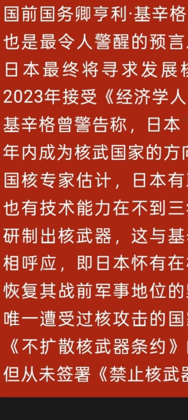 三年前基辛格先生曾警告世界,引爆第三次世界大战一定是日本。 他评价这个民族邪性且充满无知,勤奋却无道德。 目前日本拥有分离钚47吨,能造6000颗核弹。 战时动员能力一周内达到150万人, 尽管老龄化,但他65岁的老兵同样吃人。 美国放纵日本, 必遭反噬。