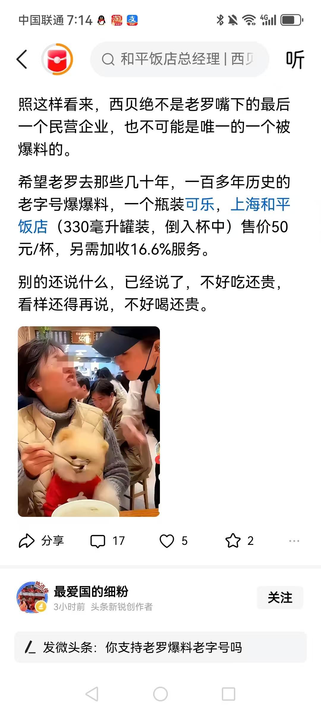罗说的是预制菜卖成现炒的价格,没有明示,并且价高量小,和平饭店就是个卖高价的地方,去哪里买的是名气和历史,不是一回事! 和平饭店当着你的面把可乐从瓶子倒出来,没骗你。 说和平饭店卖可乐50元一杯的,千万别和他计较,他说什么都对,记住!夏虫不可语冰。 和平饭店已经明确告诉你可乐和超市卖的没有区别,你爱来不来,爱吃不吃,爱喝不喝。 老罗对西贝的就餐后评价是陈述事实呢还是故意造谣恶意中伤?如果是后者,那请把老罗抓起来依法处理。如果是前者,那就让他畅所欲言。