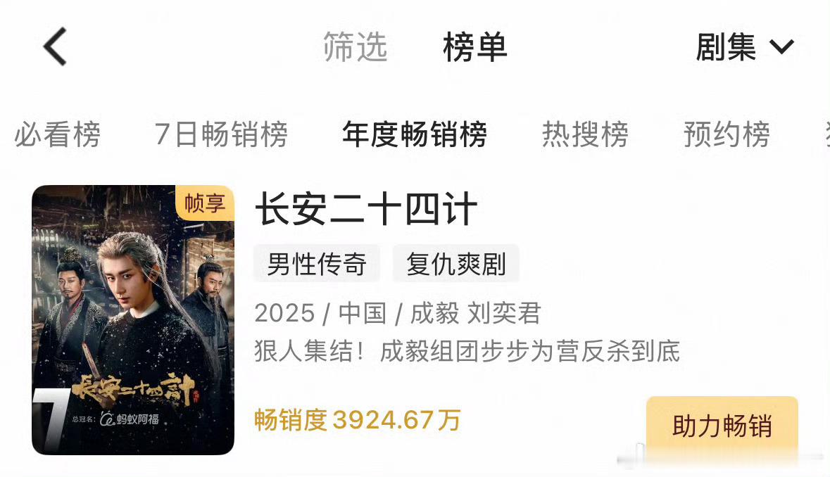 长尾效应up!成毅长安二十四计登上年度畅销榜第七名🔥