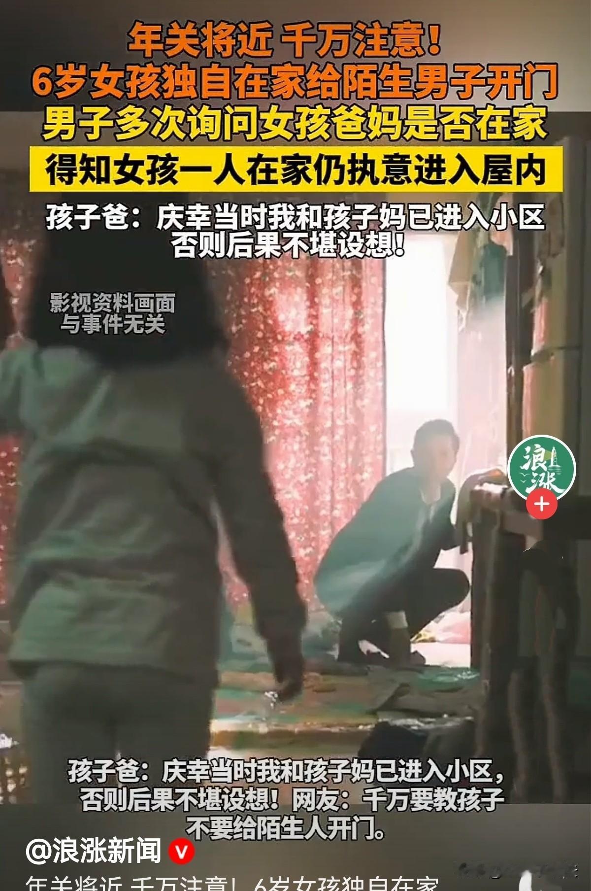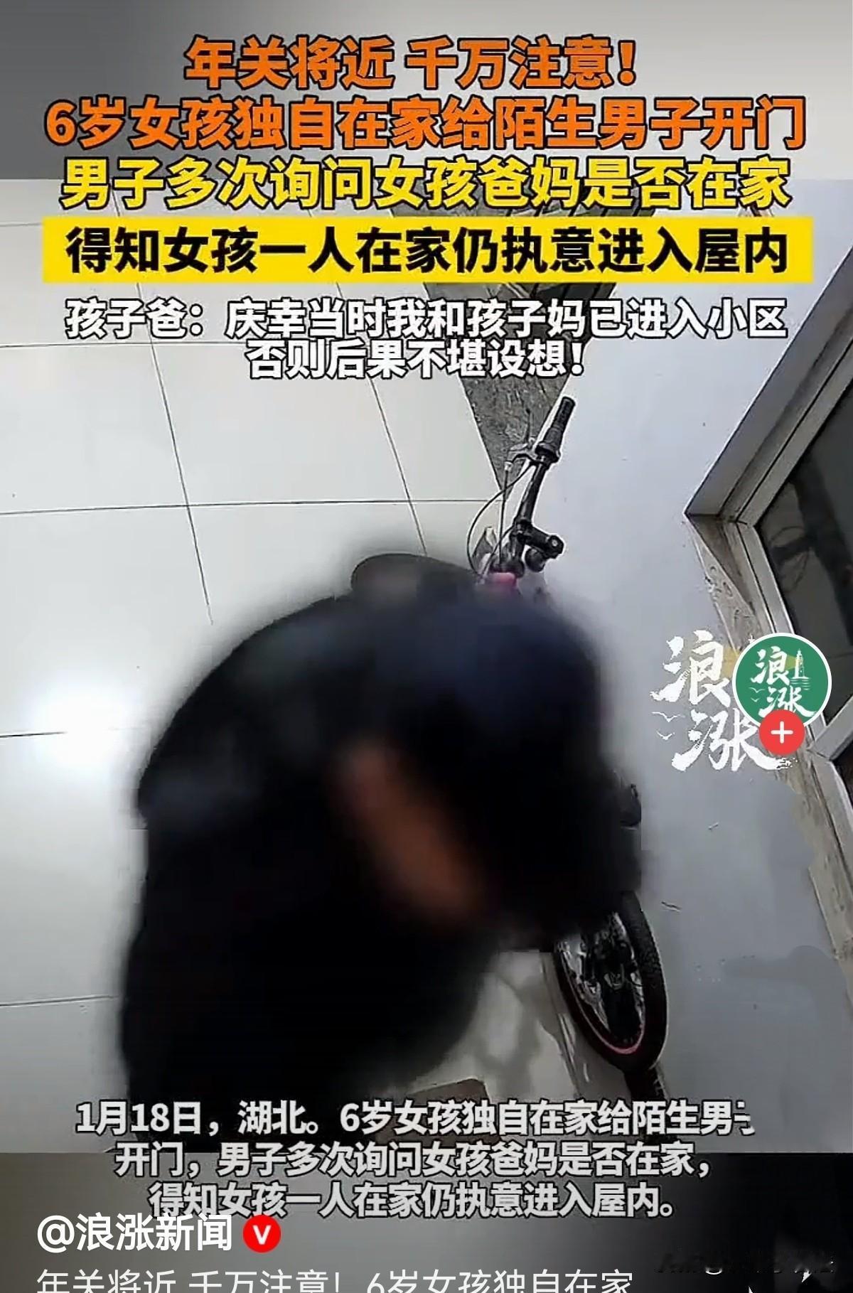 湖北武汉,父母有事需要出门办理,将放假的幼儿园6岁女儿独自放于家中,谁知一名陌生男子敲门,女儿将门打开并告知家里没人,男子多次询问确认家里没大人后,仍执意进屋,还说要给孩子父母打电话。孩子父亲:庆幸当时和孩子妈妈已进入小区,不然后果不堪设想!网友:千万要教孩子不要给陌生人开门! 年关越来越近,家家户户都在忙着备年货、盼团圆,可湖北这对父母的一场虚惊,给所有家长敲了个响警钟。 1月18号是周日,上幼儿园的6岁女儿放假,夫妻俩要出去办事,觉得也用不了多长时间,就安排女儿独自留在家玩。 临走前还反复叮嘱:千万别给陌生人开门,爸爸妈妈很快就回来。 可6岁的孩子,对危险的认知还太模糊,爸妈走后没多久,门铃就响了起来。 孩子跑到门边,透过猫眼看到一个陌生的中年男子,心里有点慌,没敢开门。 可那个男子一直敲门,小女孩打开门,开出一个缝对外面的男子说:我家里没人! 男子说你爸妈呢?他们不在家吗?女孩说:他们不在家,家里没别人! 可没想到,男子紧接着又问了一遍:你爸爸妈妈真的不在家呀?就你一个人吗? 孩子老实地点了点头说:嗯,就我一个人,爸妈去买东西了。她完全没察觉到,自己这句话已经把“软肋”暴露给了陌生人。 门外的男子问了几次,确认家里没大人,他没有离开,而是拉开了门,执意进入屋里。口里还说着:小朋友,我是你爸妈的朋友,我进来等,进去给你爸妈打个电话。 孩子年纪小,她信以为真,被对方的“理由”说动了,又想着爸妈很快回来,就没再阻拦。 陌生男子进了屋,东张西望,孩子站在原地,突然觉得有点不对劲,眼眶一红就想哭。 而就在这时,孩子爸妈刚好走进小区,快到楼下,邻居随口提了一句:刚才好像有个陌生男人进你们单元了,说是找你家的。 夫妻俩心里“咯噔”一下,撒腿就往楼上跑,一边跑一边喊女儿的名字。 屋里的男子听到门外的呼喊声,动作明显顿了一下,孩子也立刻反应过来,朝着门口大喊:“爸爸妈妈!”孩子爸妈冲到家门口,看到陌生男子已经进了客厅,顿时吓得浑身冒冷汗,赶紧挡在女儿身前,厉声质问:“你是谁?为啥闯进我家? 男子见状,支支吾吾说不出正经理由,只说“找错人了”,然后匆匆忙忙地离开了。 等男子走后,孩子爸妈抱着女儿,手还在不停地发抖。女儿受了惊吓,趴在妈妈怀里哭个不停。 孩子爸爸一边安抚女儿,一边后怕地说:“当时心都提到嗓子眼了,要是我们晚几分钟到家,后果真的不堪设想! 缓过神来后,夫妻俩第一时间报了警。民警很快赶到现场,调取了小区监控,对事件展开调查。 监控显示:一男子身材高大,穿着黑色衣裤,戴着黑色鸭舌帽,现在小女孩家门口时就东张西望,查看半天后开始敲门。 现在想想,那个陌生男子的行为疑点重重:多次确认孩子父母是否在家,得知孩子独自在家后执意闯入,显然是有备而来。 如果不是父母及时赶回,很难保证他不会做出伤害孩子、盗窃财物等违法行为。 有人说,千万不能让这么小的孩子独自在家! 有人说,教育孩子独自在家时,千万不要给陌生人开门,安全教育一定要做到位,孩子记不住等于白说! 年关前后是各类案件高发期,家长们真的不能掉以轻心。 6岁的孩子单纯善良,他们不知道恶与坏,自我保护能力几乎为零,让她独自面对复杂的外界,本身就是对安全的漠视。 很多家长觉得就离开一会儿,小区里很安全,可危险往往就发生在这一会儿里。 小女孩父母经过这次惊吓后,打算装一个智能猫眼,专门选那种能识别陌生人、还能给手机发报警提醒、现场发出警报声的款式。 一旦遇到可疑人员,还能第一时间报警,多一层保障就少一分风险。 年关将至,大家都盼着平平安安过大年,可安全意识绝不能“放假”,只有提前做好防范,才能防患于未然。 《未成年人保护法》第21条规定:未成年人的父母或者其他监护人不得使未满八周岁或者由于身体、心理原因需要特别照顾的未成年人处于无人看护状态,或者将其交由无民事行为能力、限制民事行为能力、患有严重传染性疾病或者其他不适宜的人员临时照护。 6岁女孩属于未满八周岁的未成年人,不具备自我保护能力和民事行为能力,父母将其独自留在家中,孩子无法应对陌生人员闯入等突发危险,监护人的临时脱离看护,会给孩子的人身安全带来极大隐患。 监护人履行的法定义务,不能抱有任何侥幸心理。 《刑法》第245条规定:非法搜查他人身体、住宅,或者非法侵入他人住宅的,处3年以下有期徒刑或者拘役。 陌生男子在未获得孩子父母同意的情况下,多次询问确认孩子独自在家后,执意闯入他人住宅,其行为已经涉嫌非法侵入住宅罪。 无论出于何种目的,未经住宅主人同意,都不得擅自闯入他人住宅,否则必将受到法律的制裁。 您是否告知家里的小孩不要给陌生人开门?对此您怎么看?