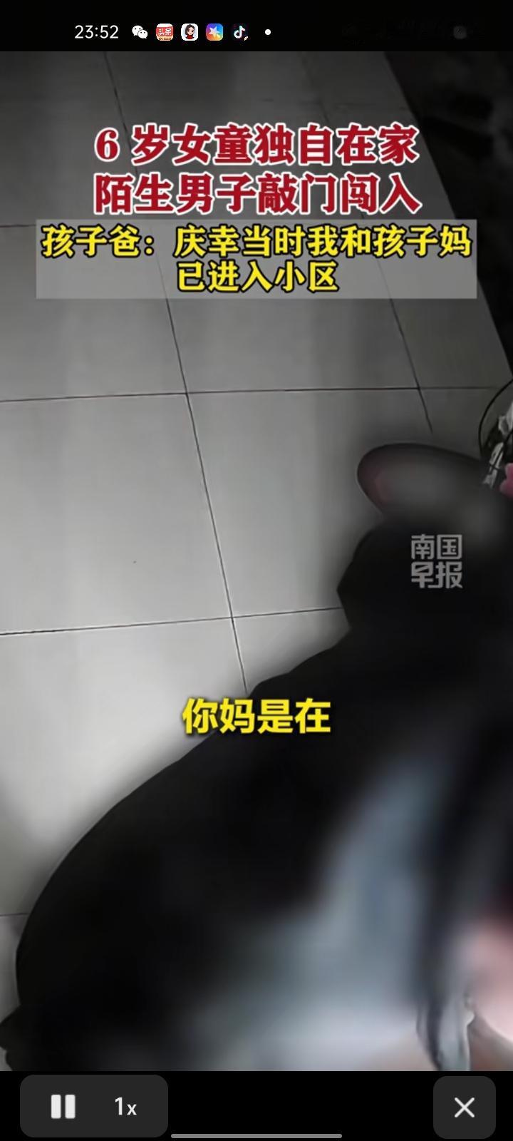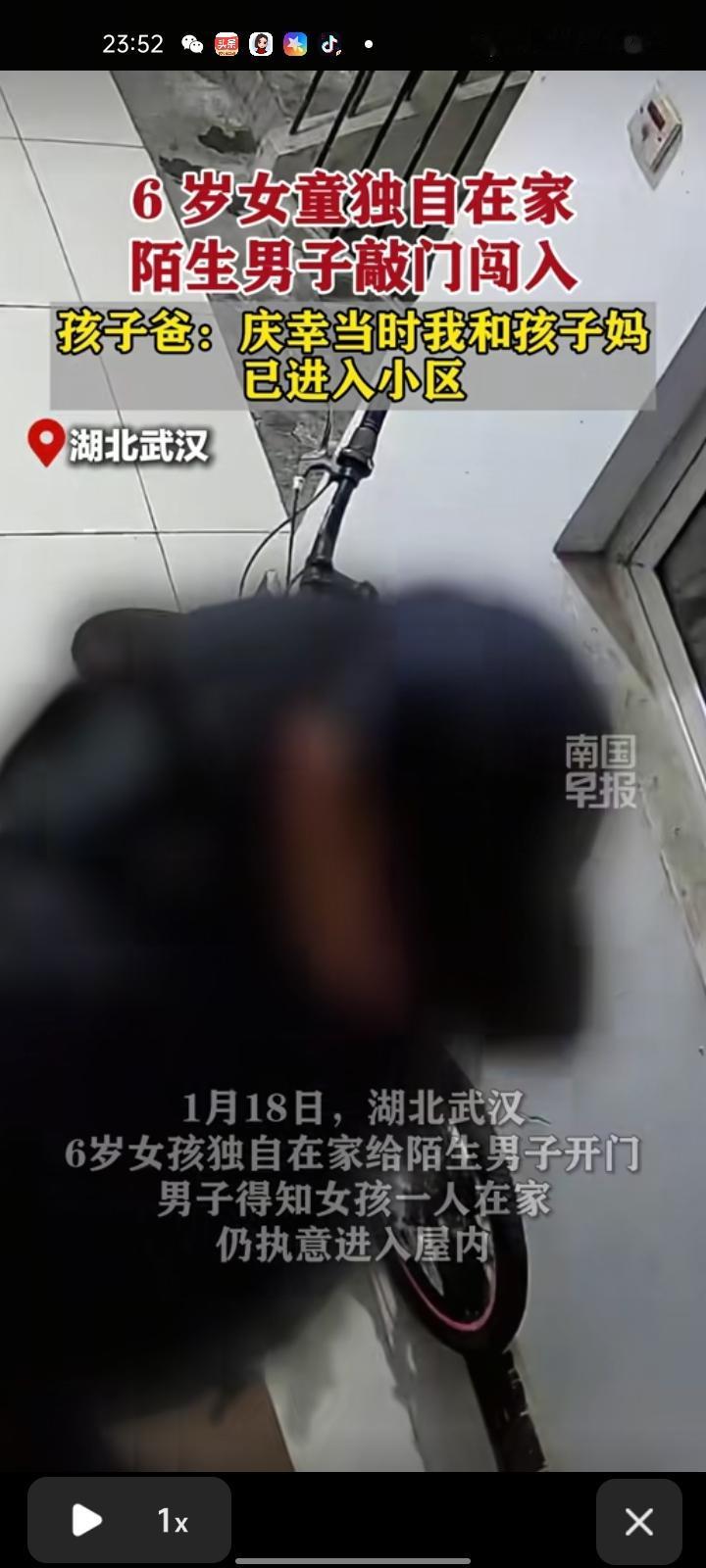 1月18日,湖北武汉。六岁女孩独自在家给陌生男子开门,男子得知女孩一人在家,仍执意进入屋内。事后,孩子爸爸称,庆幸当时他和孩子妈妈已进入小区,否则后果不堪设想,目前已报警,警方初步认为该男子私闯民宅。