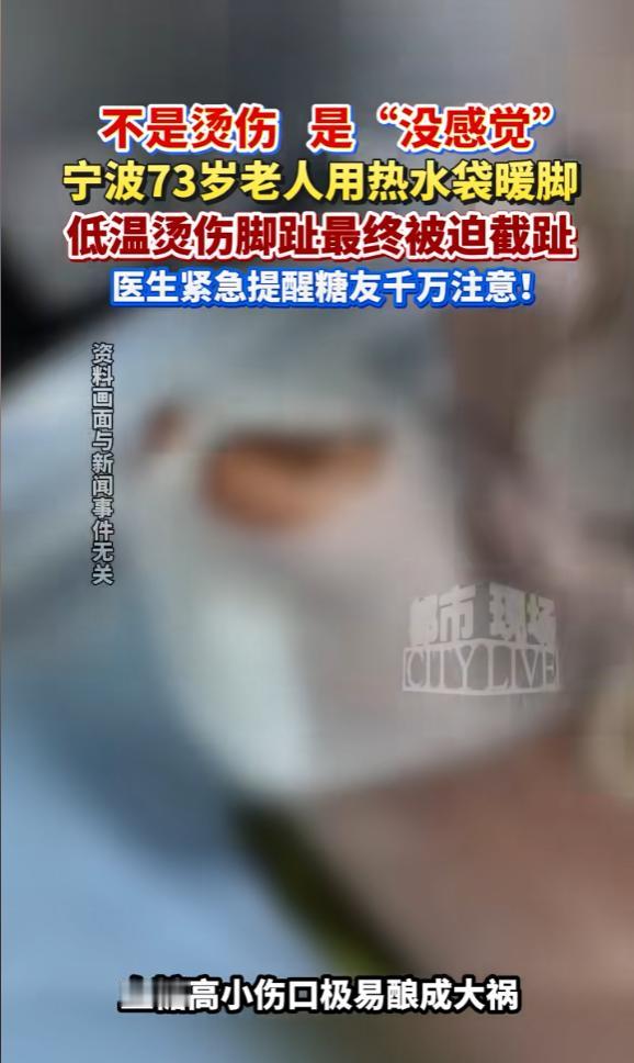 “悲剧还是发生了!”近日,浙江宁波,一大爷用热水袋暖脚时,脚趾被烫出水泡,因患糖尿病神经麻木感觉不到疼,便以为没事,就用抗生素药粉简单治疗,结果伤口溃烂,人还发起了高烧,送医时脚趾已坏疽,最终只能截趾!网友:太吓人了! 这位大爷有着十多年的糖尿病史,受病情影响,他的双脚脚趾常年处于麻木状态,对冷热、疼痛的感知力几乎完全丧失,就像失去了知觉一样。 事发当晚气温骤降,天寒地冻的,大爷和普通人一样,灌了个热水袋裹在脚上暖身,全程都没觉得有任何不适,直到睡前准备脱鞋时,才发现脚趾上起了一个硕大的水泡。 因为完全感觉不到疼痛,大爷压根没把这个水泡当回事,心里寻思着就是点不起眼的皮外伤,自己在家处理一下就行,没必要兴师动众去医院。 他随手从家里翻出抗生素药粉,对着水泡的位置撒了一些,又找了块纱布简单缠了缠,就这么草草了事,完全没意识到潜藏的致命风险。 谁也没想到仅仅过了五天时间,情况就急转直下,大爷突然发起了高烧,体温一直降不下来,脚趾上的伤口不仅没好转,反而迅速恶化,开始大面积溃烂,剧烈的疼痛让他根本无法站立,双脚连碰都碰不得。家属见状彻底慌了神,再也不敢耽搁,火急火燎地把大爷送到医院就诊。 医生接诊后对大爷的伤口进行了详细检查,看清情况后不禁大惊失色。由于伤口感染严重,大爷的脚趾组织已经彻底坏死,形成了可怕的坏疽。医生当即告知家属,必须立刻进行截趾手术,否则坏死的组织会继续扩散,连大爷的性命都会受到威胁。 这个结果像晴天霹雳一样砸在家人身上,谁也没料到当初那个不起眼的小水泡,竟然会发展到需要截肢的地步,为了保住大爷的性命,家属只能含泪同意手术。 最终医生在手术台上切除了大爷坏死的脚趾,才算勉强把他从鬼门关拉了回来。术后躺在病床上的大爷,满心都是懊悔,可世上没有后悔药,再怎么自责也无济于事。 很多人不解,为什么一个小小的水泡,会引发这么严重的后果?医生给出了解释,长期患有糖尿病,会导致严重的神经病变,让患者对冷热、疼痛的反应变得极度迟钝,就算被烫伤、磕碰,也往往浑然不觉,等察觉到异常时,伤口大多已经因为感染而恶化。 更致命的是,高血糖环境会大大降低伤口的愈合能力,哪怕是针眼大小的微小创口,只要处理不当,细菌就会快速繁殖扩散,感染速度快得惊人,短时间内就可能恶化为无法逆转的坏疽,最终只能通过截肢来阻止病情蔓延。 这起悲剧也给所有糖尿病患者和家属敲响了警钟,生活中看似平常的小事,对糖尿病患者来说,都可能暗藏风险,尤其是在寒冷天气,保暖时一定要格外注意,千万不能用暖宝宝、热水袋直接贴紧皮肤,泡脚时水温也绝对不能超过37度,最稳妥的办法就是用手肘测试水温,避免烫伤。 除此之外糖尿病患者身上无论出现多小的伤口,哪怕只是擦伤、针眼大小的创口,都绝对不能像这位大爷那样自行处理,更不能随意使用抗生素药粉,药不对症不仅治不好伤口,还会加重感染,一定要第一时间去医院,寻求专业医生的帮助,规范处理伤口。 本来只是想暖个脚抵御寒冷,却因为一时的侥幸和错误处理,付出了截趾的惨痛代价,这样的教训实在太过沉重。大爷的经历也提醒着身边有糖尿病患者的朋友,一定要把这些安全常识转达给他们,避免类似的悲剧再次发生。 说到底,糖尿病患者的日常护理容不得半点疏忽,任何微小的疏忽都可能引发严重后果,希望这起悲剧能让更多人重视起来,谨慎对待每一个细节,守护好自己和家人的健康,别让一时大意,留下终身遗憾。 (信息来源:《不是烫伤是"没感觉"!宁波一老人暖脚竟致截趾,医生提醒:糖友千万警惕低温烫伤!》都市现场)